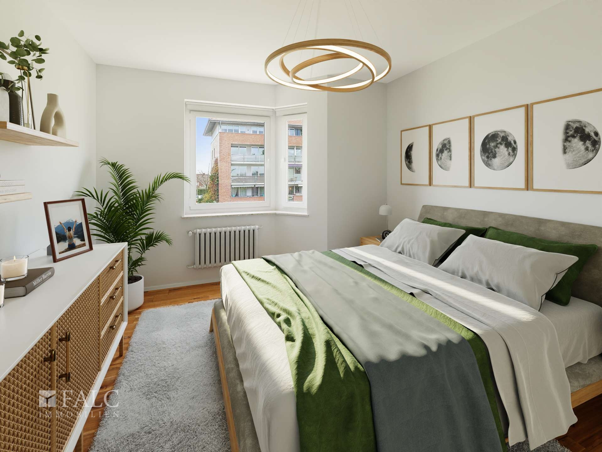 Das Schlafzimmer bietet genügend Raum für ein großes Bett und einen Kleiderschrank. Auch hier sorgen die Fenster für viel Licht und eine angenehme Wohnatmosphäre.
