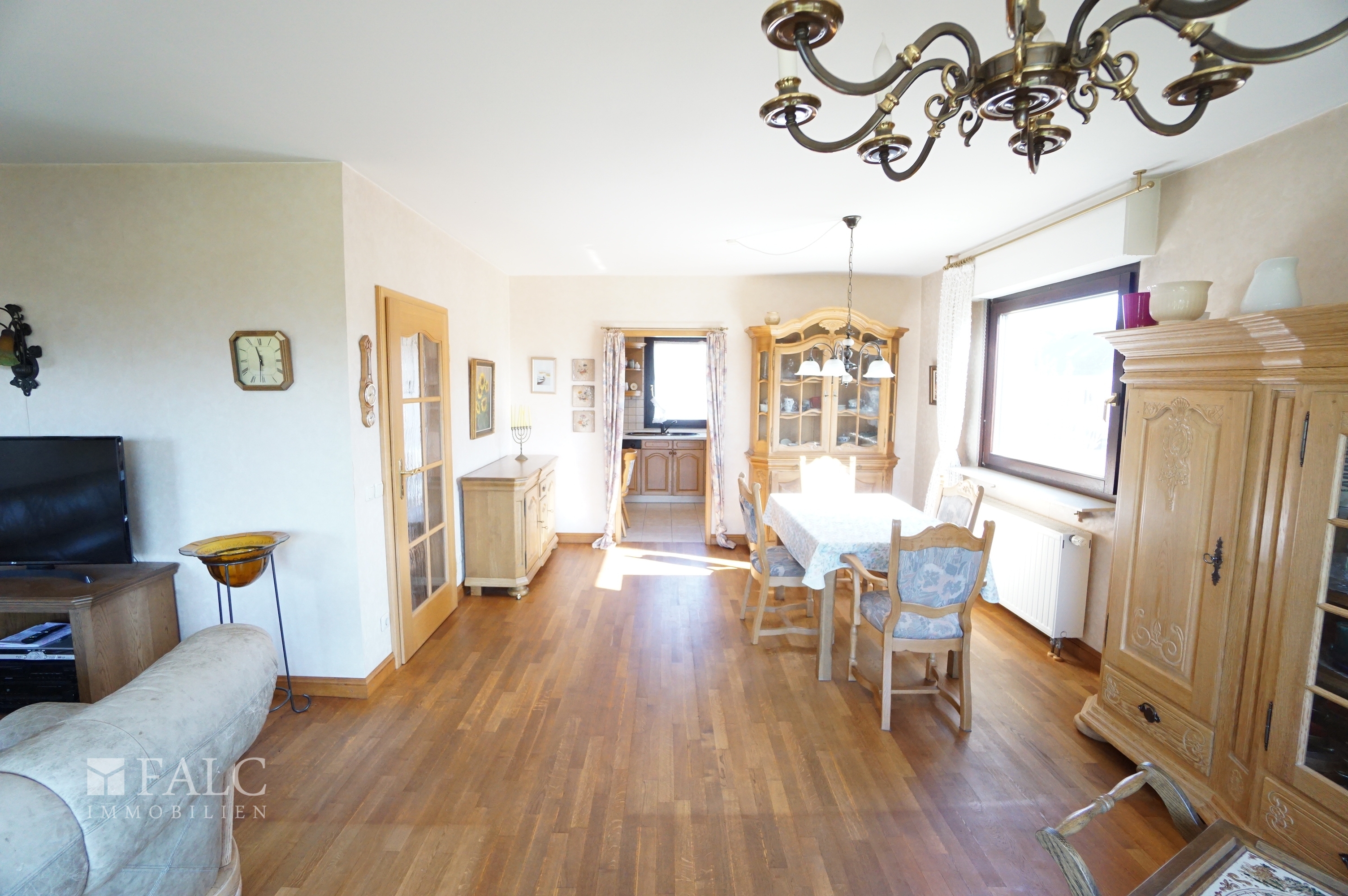 Im Erdgeschoss empfängt Sie eine helle Diele mit Garderobenbereich. Von hier aus sind die Räume angenehm getrennt erreichbar. Das Wohnzimmer mit ca. 36,21 m² wirkt durch die großen Fensterflächen besonders freundlich und bietet direkten Zugang zur Terrasse und in den Garten. Die Küche ist separat gehalten und funktional geschnitten, ideal für den Alltag. Ein Gäste WC ergänzt das Raumangebot auf dieser Ebene. Außerdem befinden sich hier ein Elternschlafzimmer, das sich flexibel als Kinderzimmer, Büro oder Gästezimmer nutzen lässt. Das Tageslichtbad ist klassisch ausgestattet und bietet ausreichend Platz.