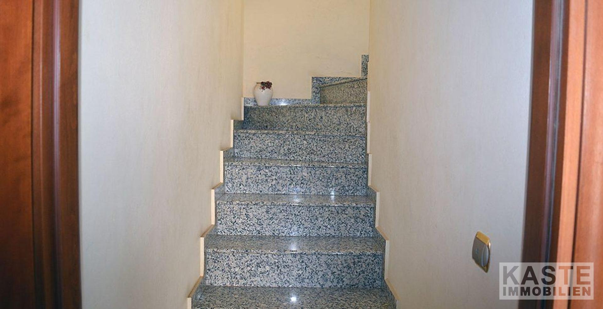Das Erdgeschoss besteht aus einer Küche im Steindesign inkl. Geräten und einem Essbereich mit schöner Aussicht auf das Dorf und die Berge. Von hier aus gehen Sie ein paar Stufen hinunter in den geräumigen Wohn- und Essbereich mit großem offenem Kamin und Holzofen. Auf dieser Ebene befindet sich auch das Badezimmer.