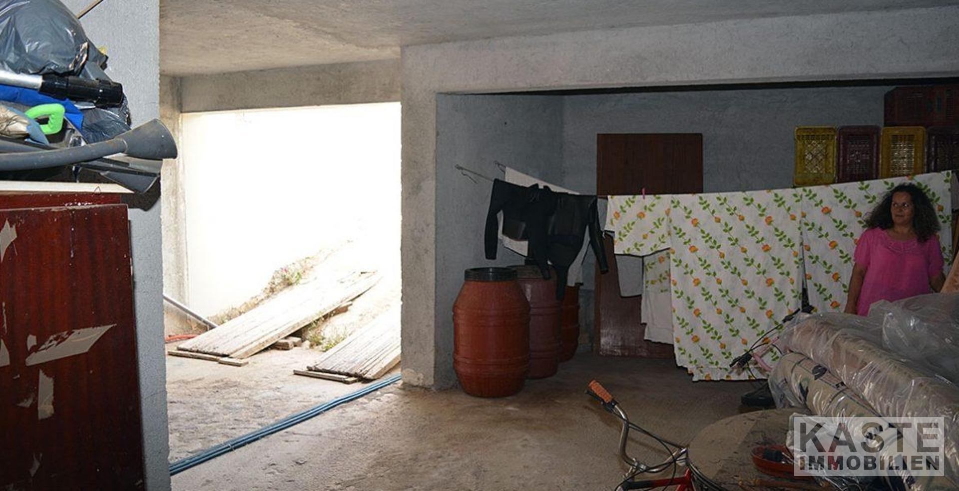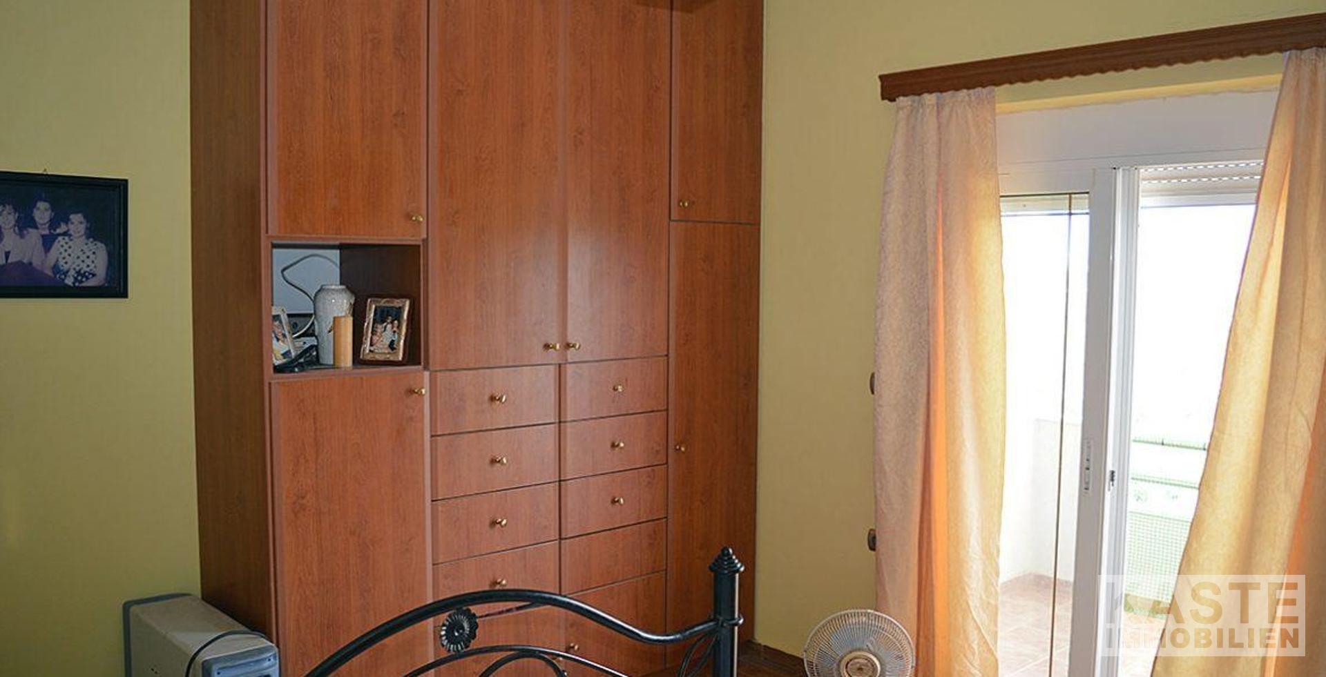 In der ersten Etage befinden sich zwei helle und luftige Schlafzimmer und ein kleineres Zimmer, das bei Bedarf als drittes Schlafzimmer genutzt werden kann. Das Hauptschlafzimmer enthält ein eingebautes Doppelbett aus Stein und ein zweites Schlafzimmer mit 2 eingebauten Einzelbetten. Vom zweiten Schlafzimmer aus gelangt man nach draußen auf einen Balkon und eine Dachterrasse, die unter einer Pergola mit hübschen Weinstöcken liegt. Beide haben einen fantastischen Blick auf das Dorf, die Berge und hinunter zum Meer.