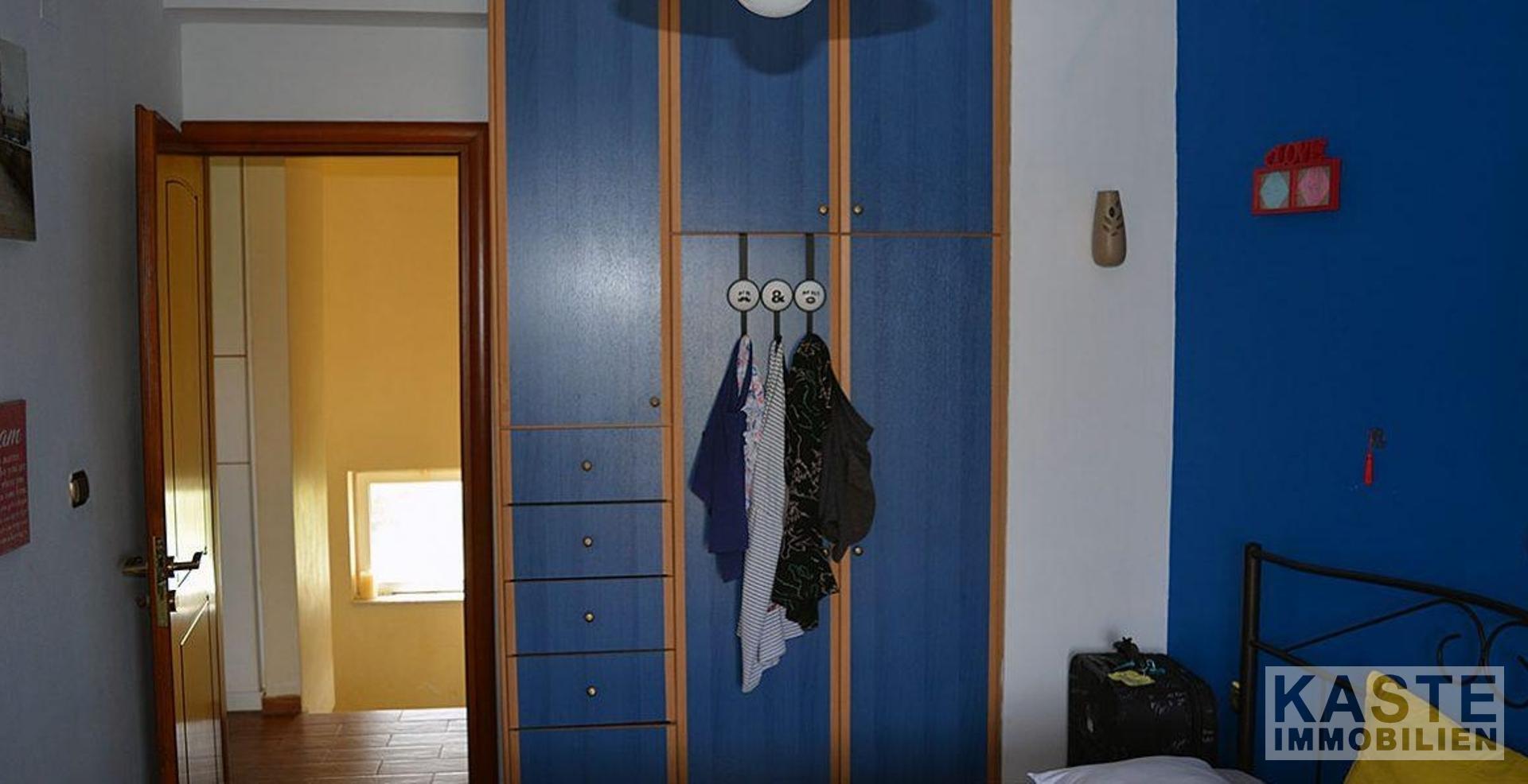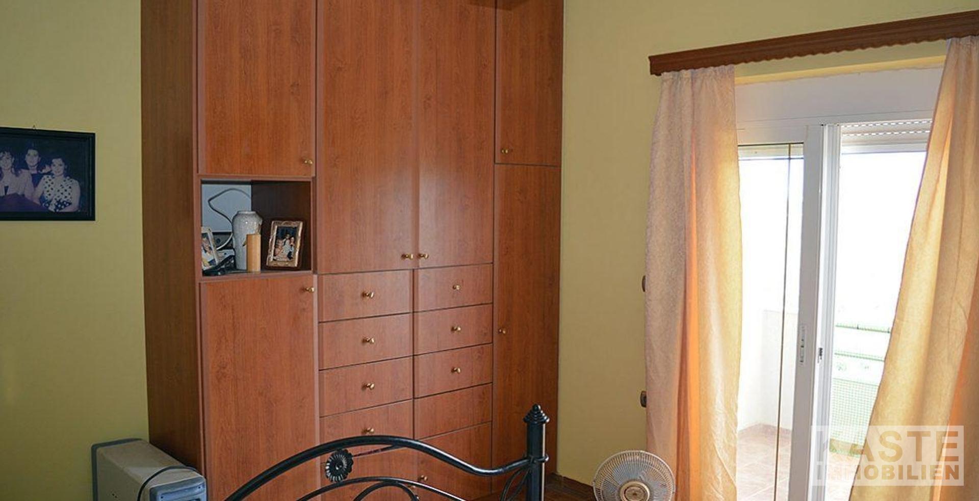 In der ersten Etage befinden sich zwei helle und luftige Schlafzimmer und ein kleineres Zimmer, das bei Bedarf als drittes Schlafzimmer genutzt werden kann. Das Hauptschlafzimmer enthält ein eingebautes Doppelbett aus Stein und ein zweites Schlafzimmer mit 2 eingebauten Einzelbetten. Vom zweiten Schlafzimmer aus gelangt man nach draußen auf einen Balkon und eine Dachterrasse, die unter einer Pergola mit hübschen Weinstöcken liegt. Beide haben einen fantastischen Blick auf das Dorf, die Berge und hinunter zum Meer.