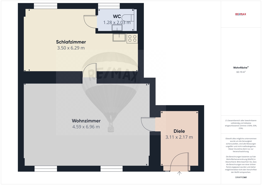 Provision: Die Maklerprovision in Höhe 3,57% inkl. 19% MwSt. vom Kaufpreis ist mit Abschluss des Kaufvertrages verdient und fällig. RE/MAX erhält einen unmittelbaren Zahlungsanspruch gegenüber dem Käufer (Vertrag zugunsten Dritter, § 328 BGB). Bei Kaufpreisen unter 100.000,- Euro werden 3.570,- Euro berechnet.