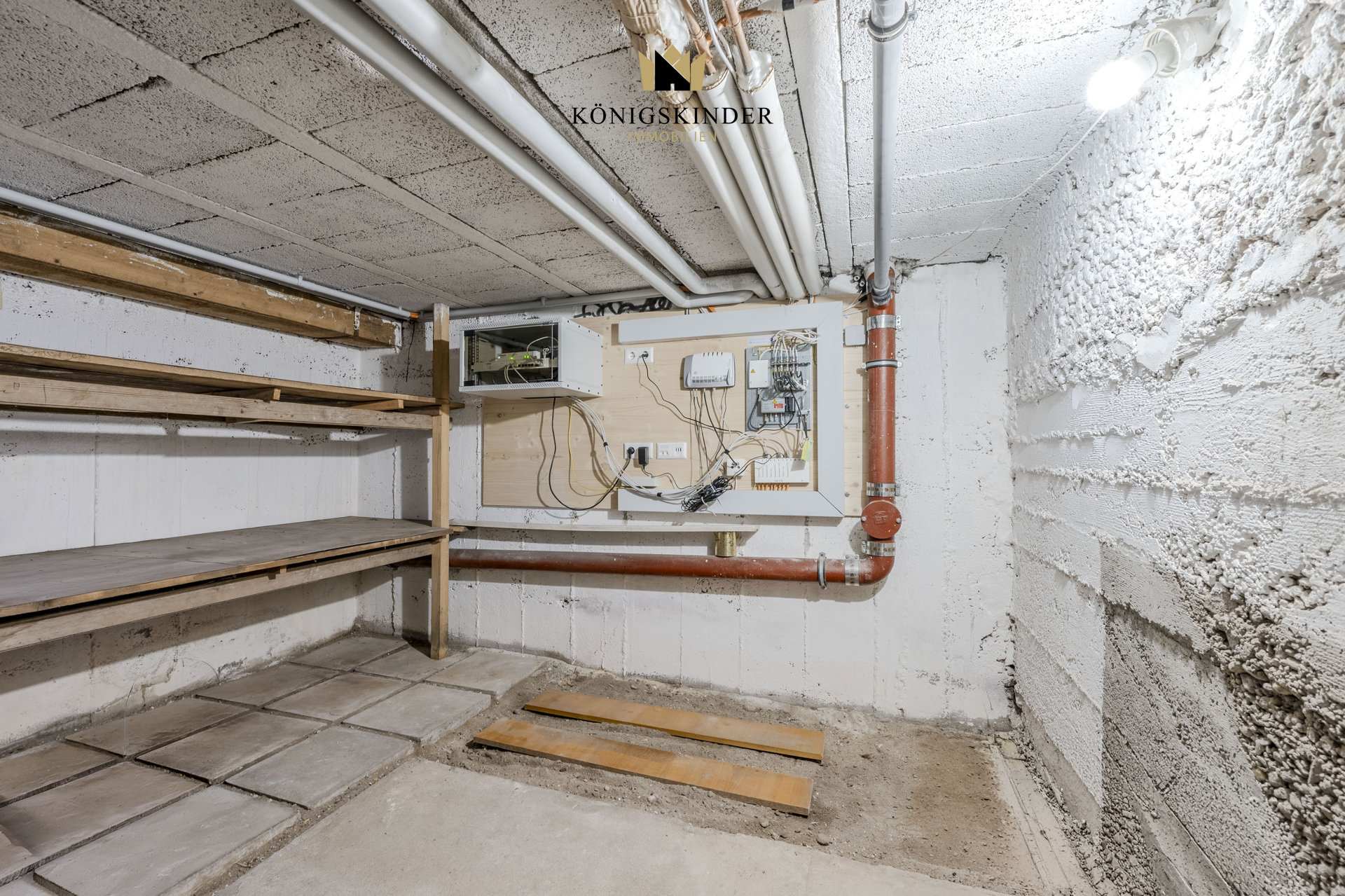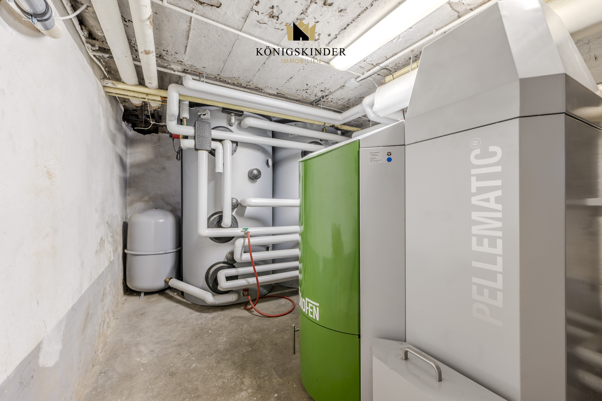 Der Kellerbereich umfasst mehrere Nutzräume, eine neue Pelletheizung (Einbau 2022) sowie eine Waschküche. Von hier aus gelangt man direkt in den Außenbereich und zur Einzelgarage. Ergänzt wird das Anwesen durch zwei Außenstellplätze sowie ein praktisches Gartenhaus zur Unterbringung von Gartengeräten.