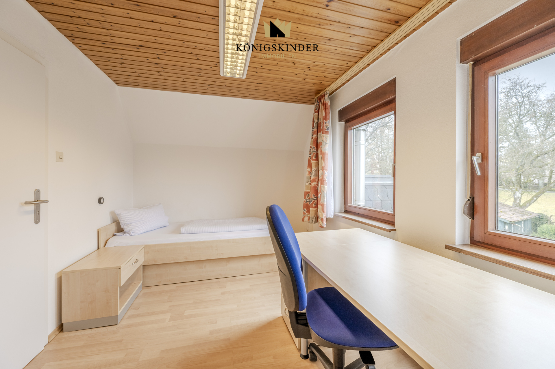 Das 2018 neugestaltete Obergeschoss bietet weitere Einzelzimmer, wobei eines der Zimmer auf einer Zwischenetage liegt. Im Dachgeschoss stehen drei zusätzliche Einzelzimmer zur Verfügung. Über das Dachgeschoss gelangt man zudem auf den Dachboden, der vielseitige Nutzungsmöglichkeiten eröffnet. Alle Wohn- und Schlafräume sind aktuell vollständig möbliert mit Bett, Schrank und Schreibtisch. Einige Zimmer verfügen über ein eigenes Bad, andere nutzen ein Etagenbad mit WC.