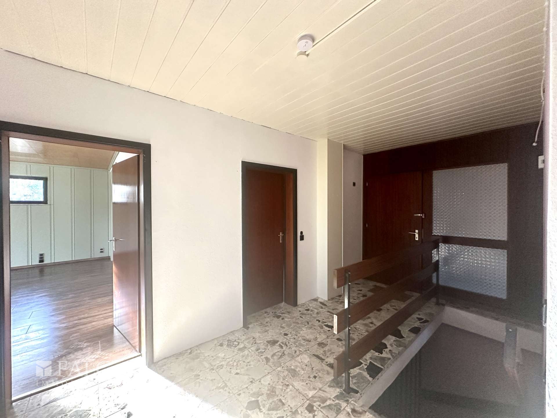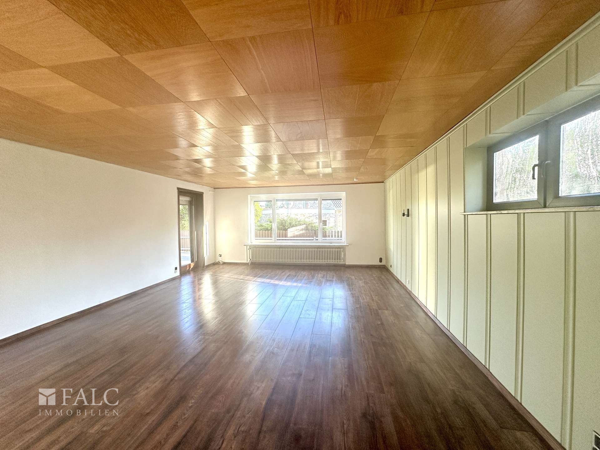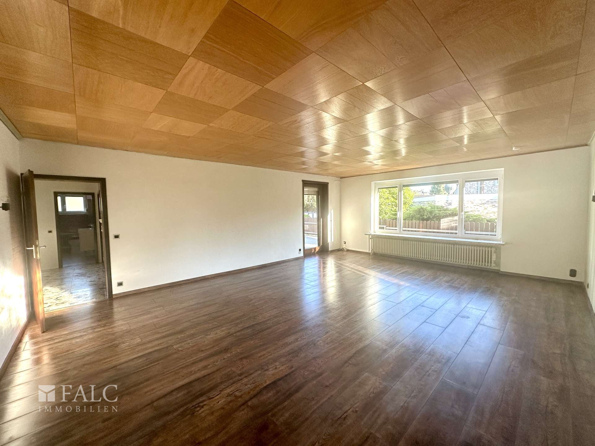 - eigene Auffahrt - eigener Eingang/Haustür - großer und heller Flur (Fliesen) - Küche mit Einbauküche (Fliesen) - helles und großzügiges Wohn- und Esszimmer (dunkles Laminat) - drei weitere Zimmer zur individuellen Nutzung, eines davon mit Zugang zur Terrasse (Laminat) - Bad mit Wanne, Waschtisch, WC und Fenster (Fliesen) - Gäste-WC mit modernem Waschbecken (Fliesen) - große, erhöhte Terrasse, teilweise überdacht - Zugang/Treppe zum Keller (Flur) - Garage mit Abstellraum/Werkstatt