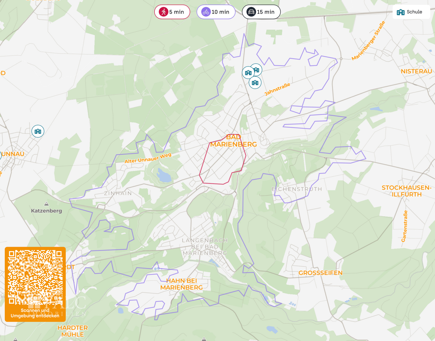 Verkehrstechnisch ist Bad Marienberg sehr gut angebunden. Über die nahegelegenen Bundesstraßen B255 und B414 sowie die Autobahn A3 (Köln–Frankfurt) ist eine schnelle Anbindung an die Oberzentren Montabaur, Koblenz und Siegen gewährleistet. Der ICE-Bahnhof in Montabaur ist in ca. 25 Minuten erreichbar und bietet direkte Verbindungen nach Frankfurt und Köln – ein echter Standortvorteil für Pendler und Berufstätige.