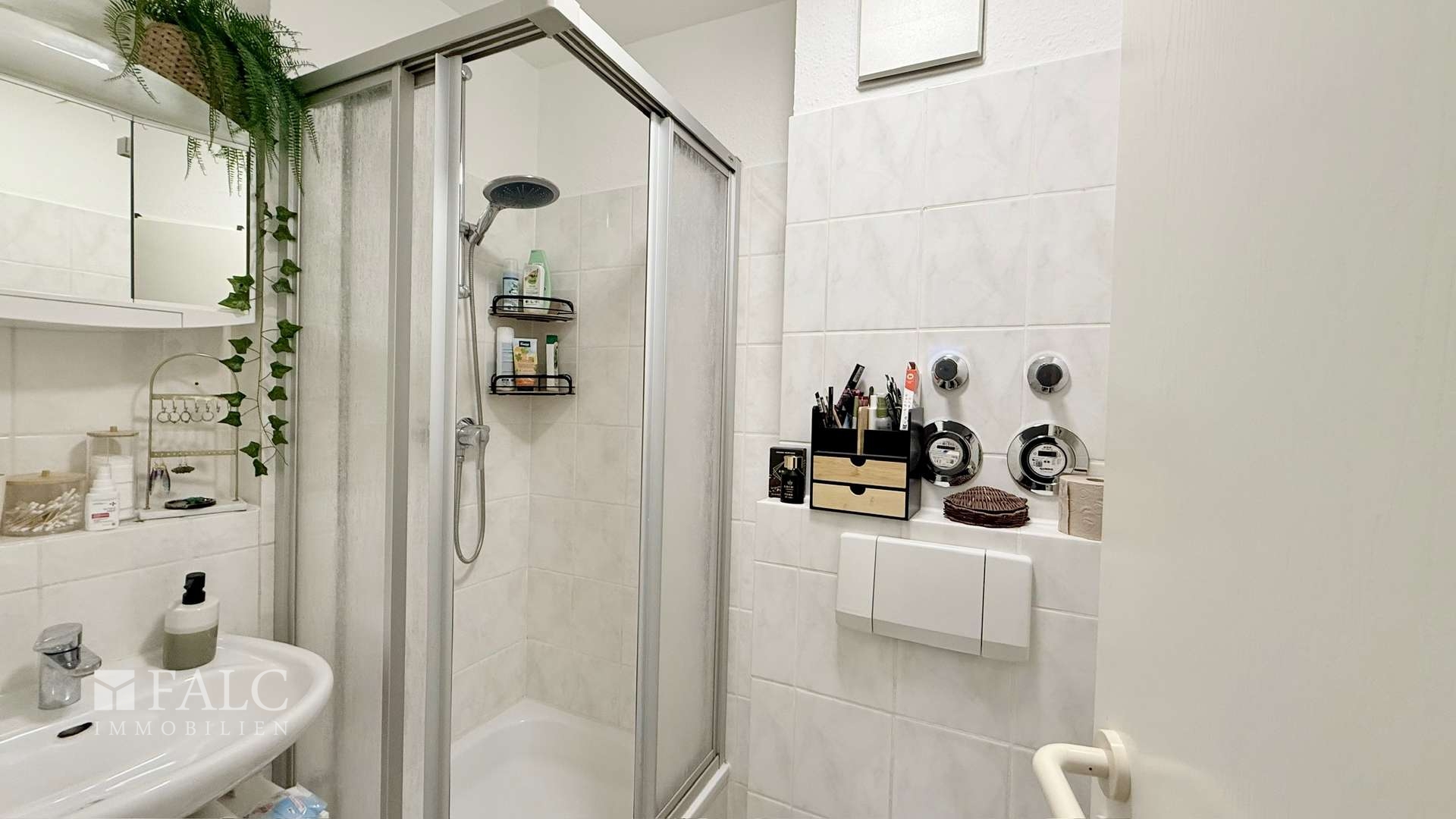Das Badezimmer ist mit einer Dusche ausgestattet und bietet zusätzlichen Komfort.