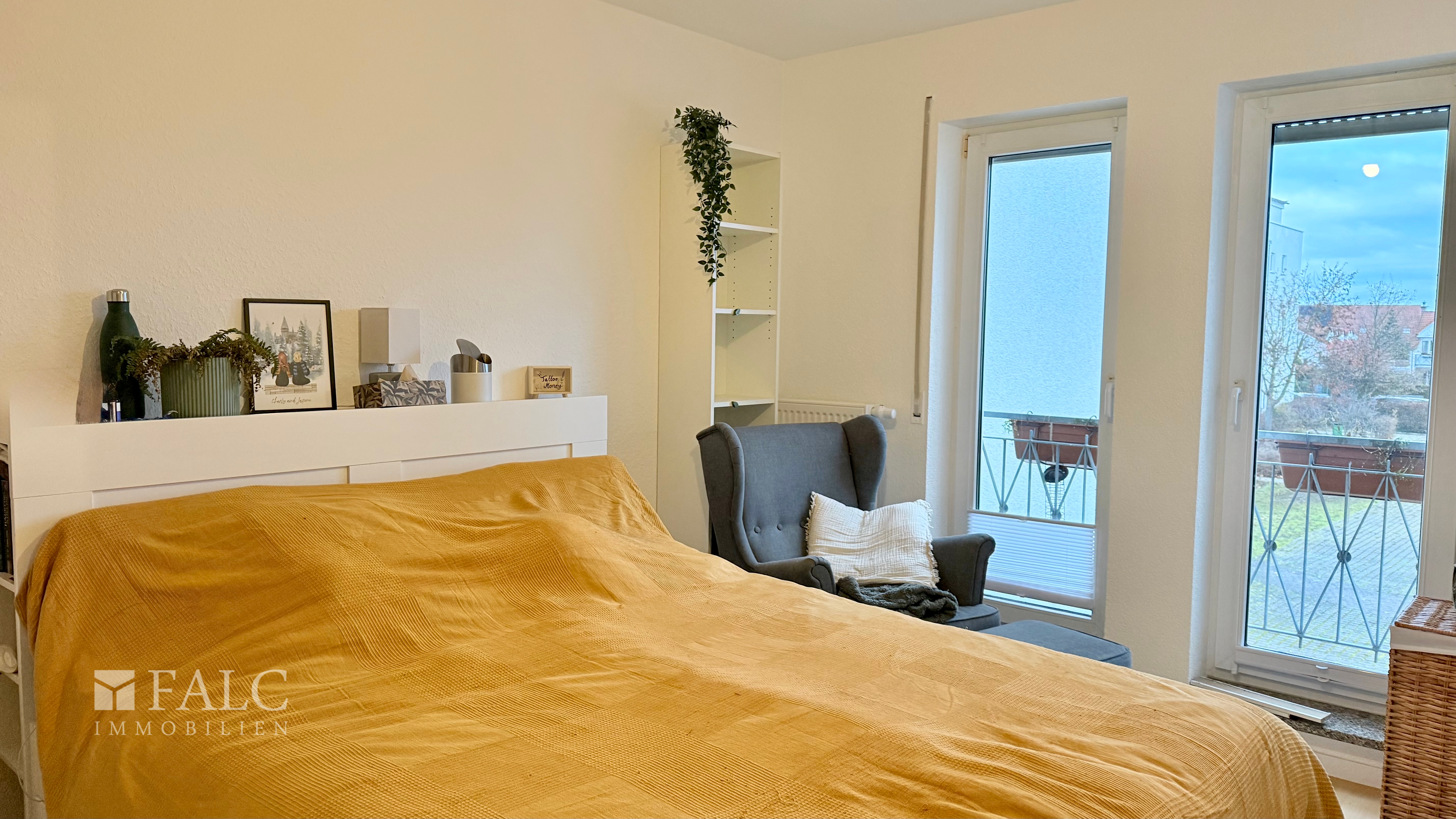 Das Schlafzimmer ist ruhig gelegen und bietet ausreichend Platz für ein großes Bett und einen Kleiderschrank. Auch hier sorgen große Fenster für eine helle und freundliche Atmosphäre.