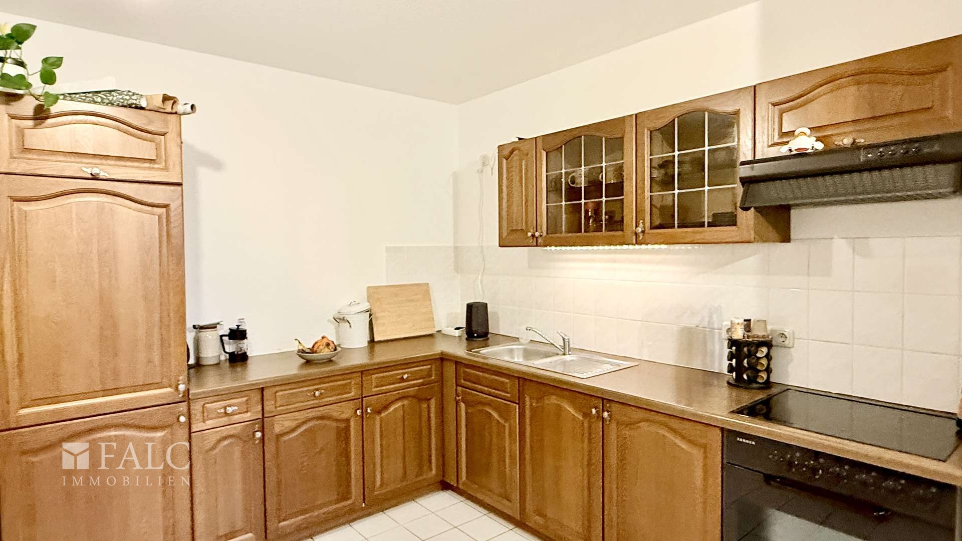 Die angrenzende Einbauküche ist funktional gestaltet und bietet alles, was Sie zum Kochen benötigen. Der Übergang zwischen Wohn- und Essbereich ist fließend, was den Raum besonders großzügig wirken lässt.