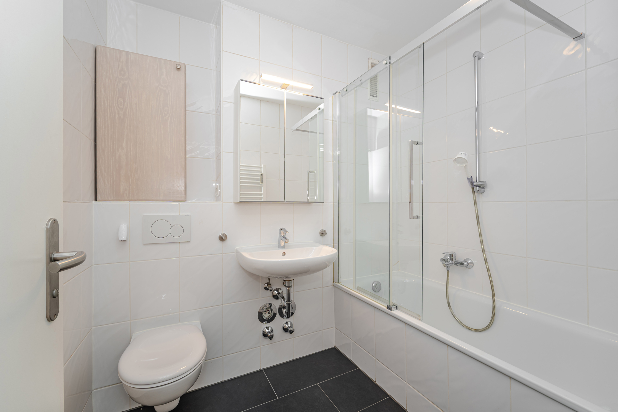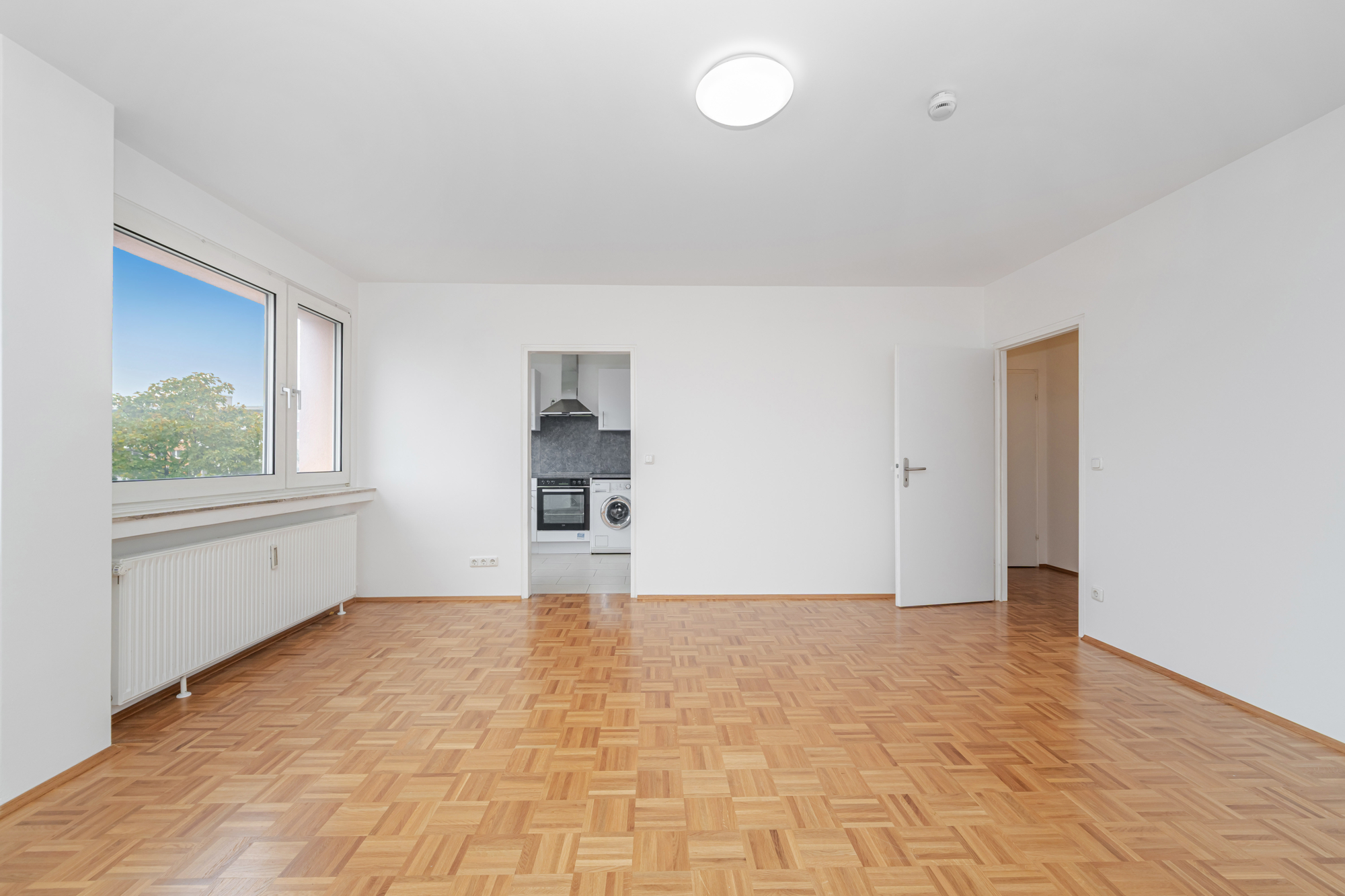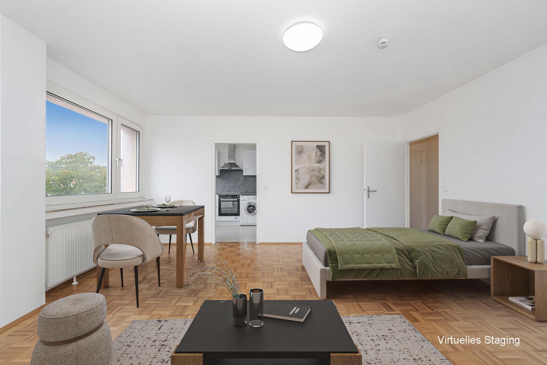 - Wohnfläche: ca. 38,86 m² - 6. Obergeschoss (insgesamt 8) mit Aufzug - Frisch gestrichen im September 2025 - Baujahr Wärmeerzeuger 2000 - Hochwertiger Mosaikparkettboden im klassischen Würfelmuster – elegant und zeitlos - Großzügiger Wohn- und Schlafbereich mit großer Fensterfront - Küche mit großer Fensterfront – viel Licht und Ausblick ins Grüne - Moderne, zeitlose Einbauküche in Weiß mit dunkler Arbeitsplatte - Herd-/Ofen-Kombination, Waschmaschine, Spülmaschine - Freistehende Kühlschrank-Gefrierkombination - Badezimmer mit Duschwanne, WC und Waschbecken - Kellerabteil und Tiefgaragen-Einzelstellplatz - Waschkeller mit Münzwaschmaschine und -trockner - Trockenraum und Fahrradkeller - Kunststofffenster zweiflügelig, Ausrichtung nach Westen - Umfassende Modernisierungen/Renovierungen in 2014: Bad, Böden, Wände, Elektrik (inkl. FI), Leitungen ab Hauptstrang - Ruhige, grüne Wohnlage - gute Verkehrsanbindung