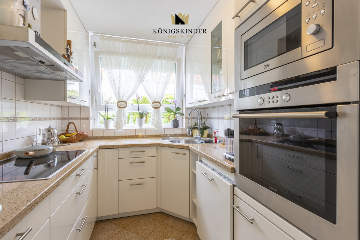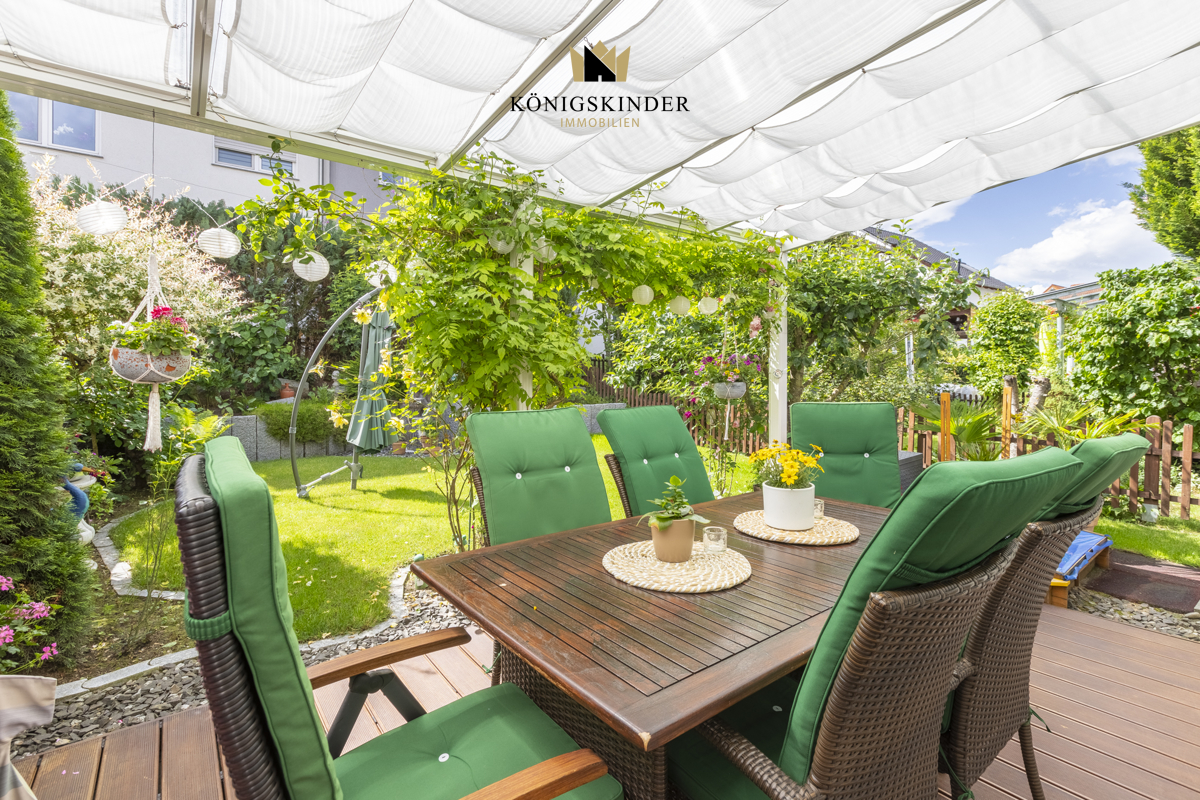 Der großzügige Wohn- und Essbereich mit hochwertigen Fliesen bildet das Herzstück des Hauses. Die separate Einbauküche ist mit modernen Markengeräten ausgestattet und bietet alles, was Hobbyköche benötigen. Vom Wohnbereich aus gelangen Sie direkt in den gepflegten Garten, der dank überdachter Terrasse, Pergola und integriertem Sonnenschutz zu jeder Jahreszeit zum Verweilen einlädt – perfekt für entspannte Stunden im Freien.