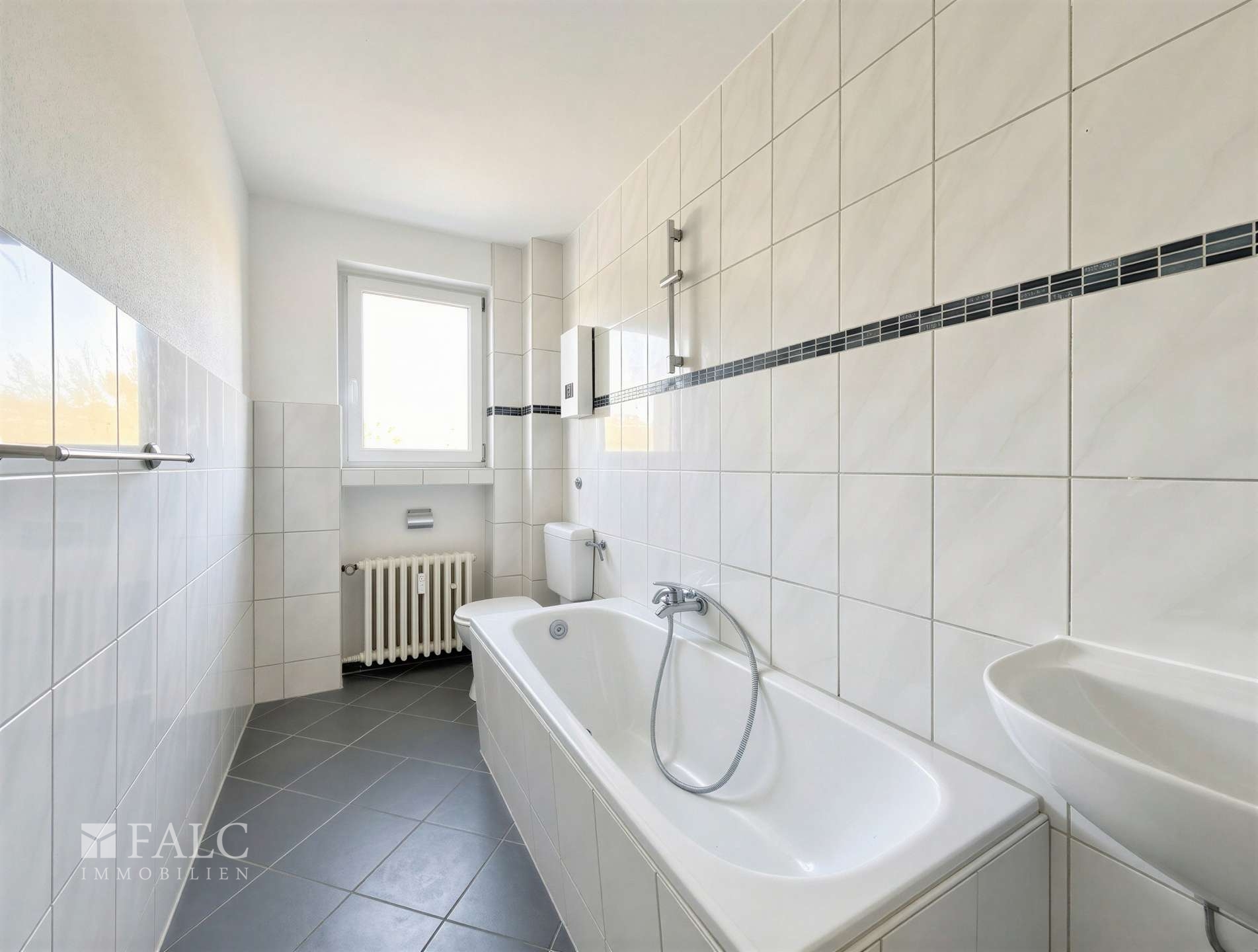 Die Küche ist mit einem weißen Fliesenspiegel ausgestattet und wirkt hell und zeitlos. Ein integrierter Vorratsschrank bietet zusätzlichen Stauraum und erhöht den praktischen Nutzen der Wohnung. Das Tageslichtbad präsentiert sich gepflegt mit klassischer Fliesengestaltung und einer Duschwanne.