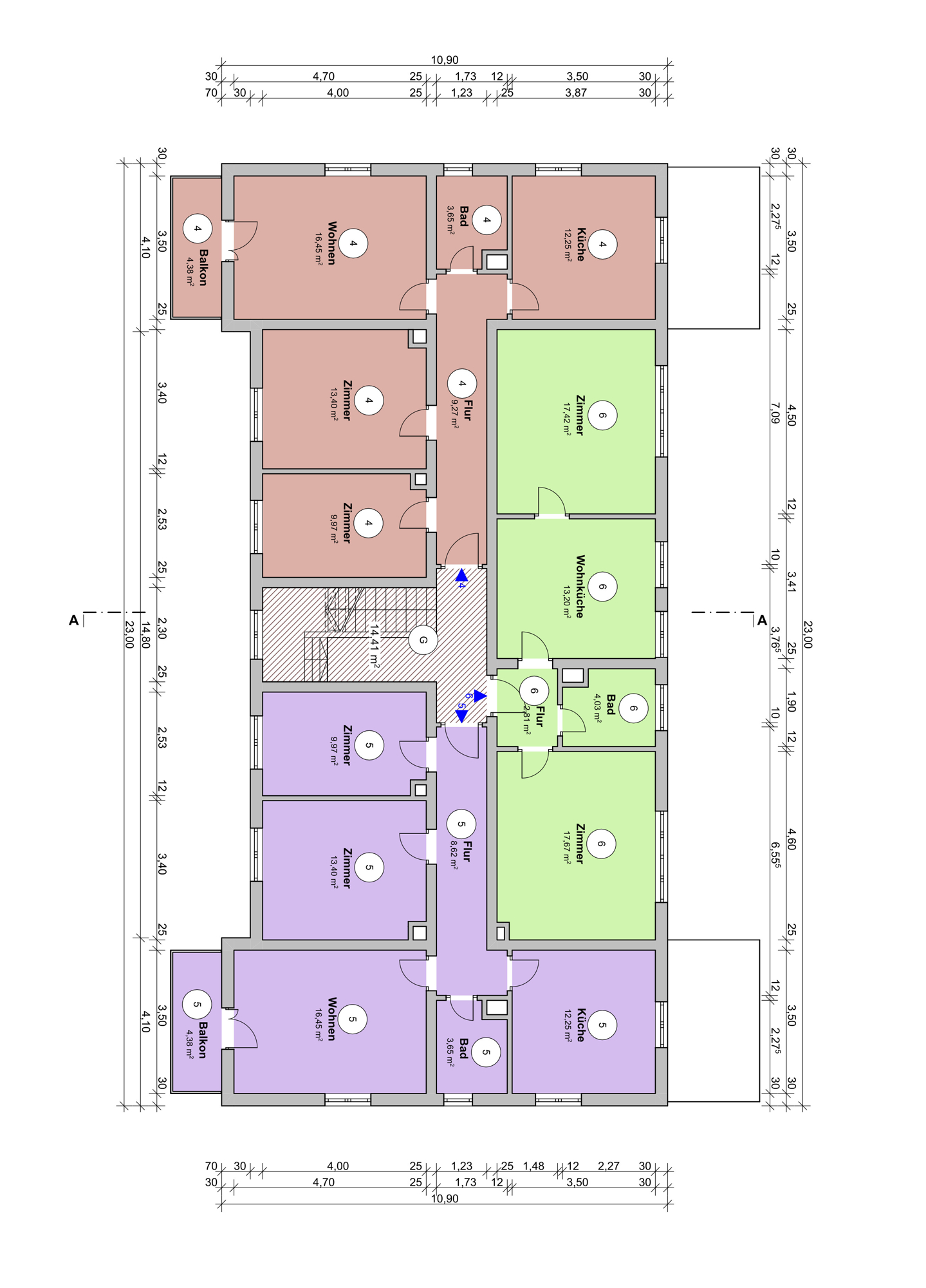 6 x 3-Zimmer-Wohnungen mit einer Wohnküche (bestehend aus zwei Schlafzimmern, Wohnzimmer und einer Wohnküche).