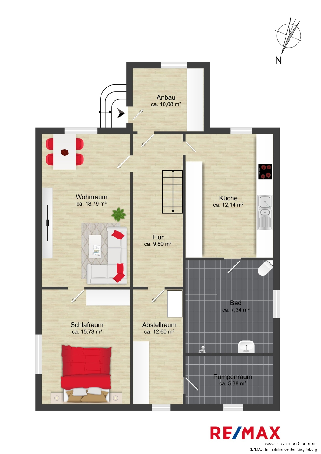 Erdgeschoss: - Diele, - Schlafzimmer, - Wohnzimmer, - Küche mit Einbauküche, - modernes Bad mit ebenerdiger Dusche und Fußbodenheizung, - Abstellraum