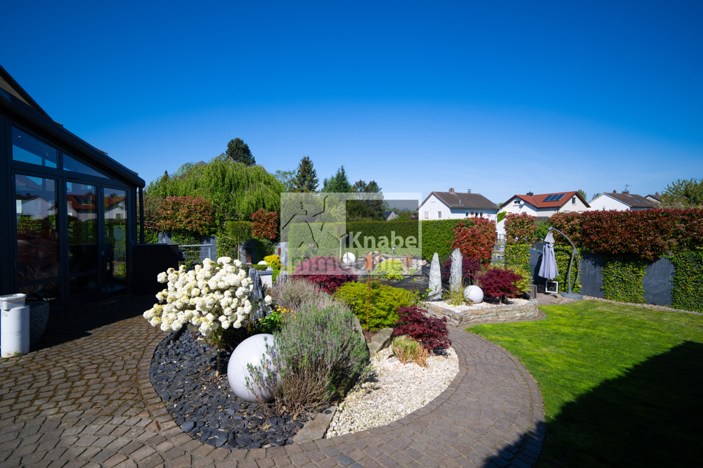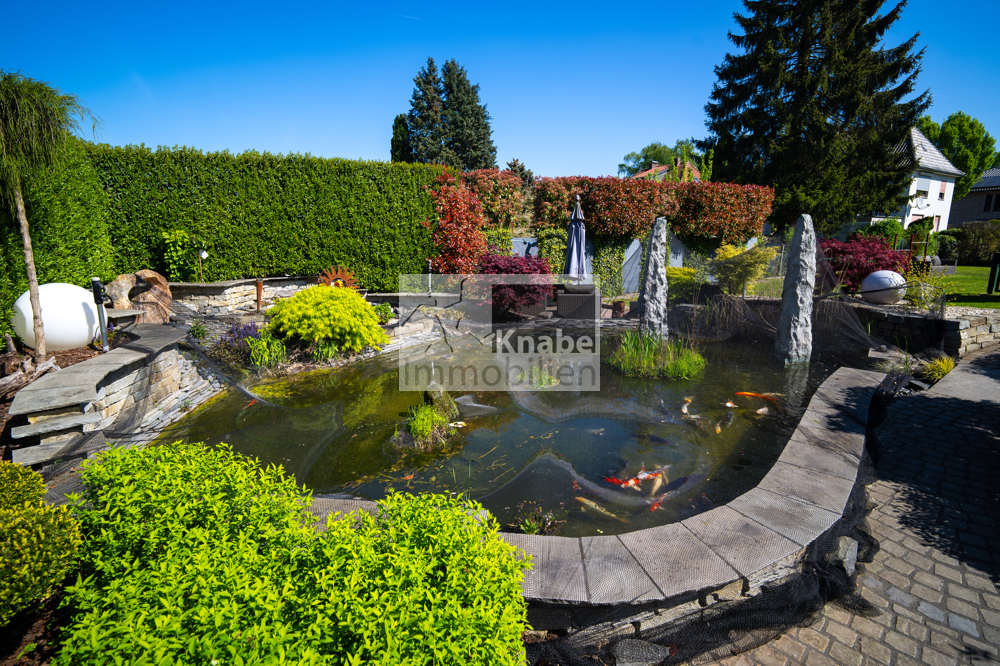 Neben zwei Wintergärten, die sich zur Terrasse öffnen, lädt der professionell angelegte Garten mit stilvollem Teich und weiterem Freisitz zur Entspannung und Erholung ein.