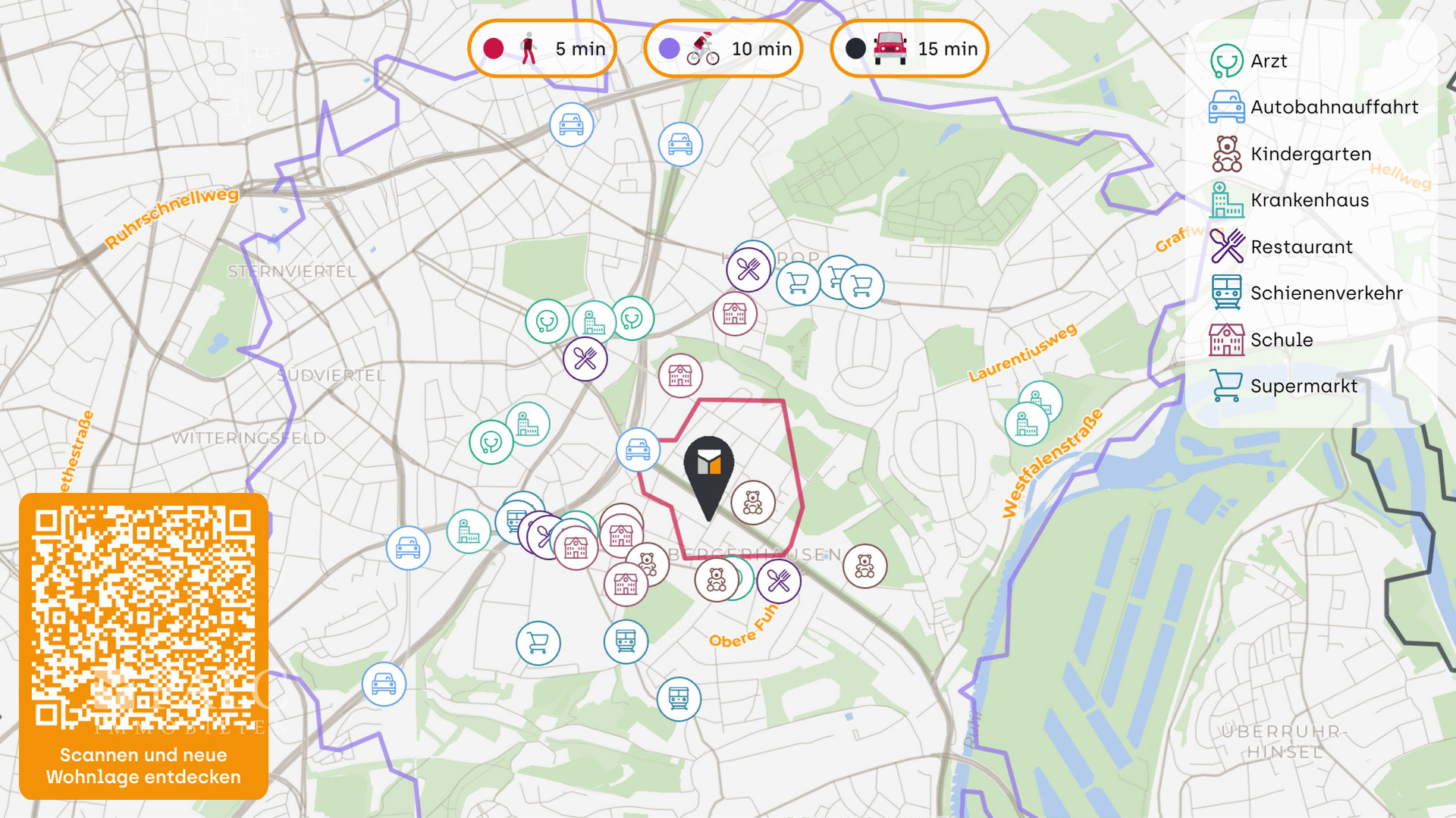 Wer in seiner Freizeit sportlich aktiv sein möchte, wird sich über das nahegelegene Fitnessstudio FitX Essen-Bergerhausen in ca. 402 Metern Entfernung freuen. Die grünen Oasen der Stadt, wie der Park Siepental, sind ebenfalls in wenigen Gehminuten erreichbar und laden zu erholsamen Spaziergängen ein.
