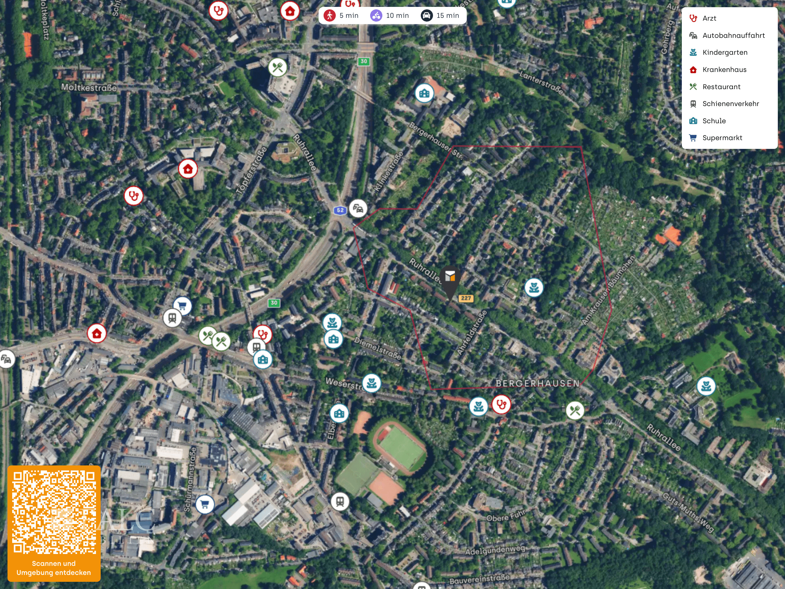 Wer in seiner Freizeit sportlich aktiv sein möchte, wird sich über das nahegelegene Fitnessstudio FitX Essen-Bergerhausen in ca. 402 Metern Entfernung freuen. Die grünen Oasen der Stadt, wie der Park Siepental, sind ebenfalls in wenigen Gehminuten erreichbar und laden zu erholsamen Spaziergängen ein.