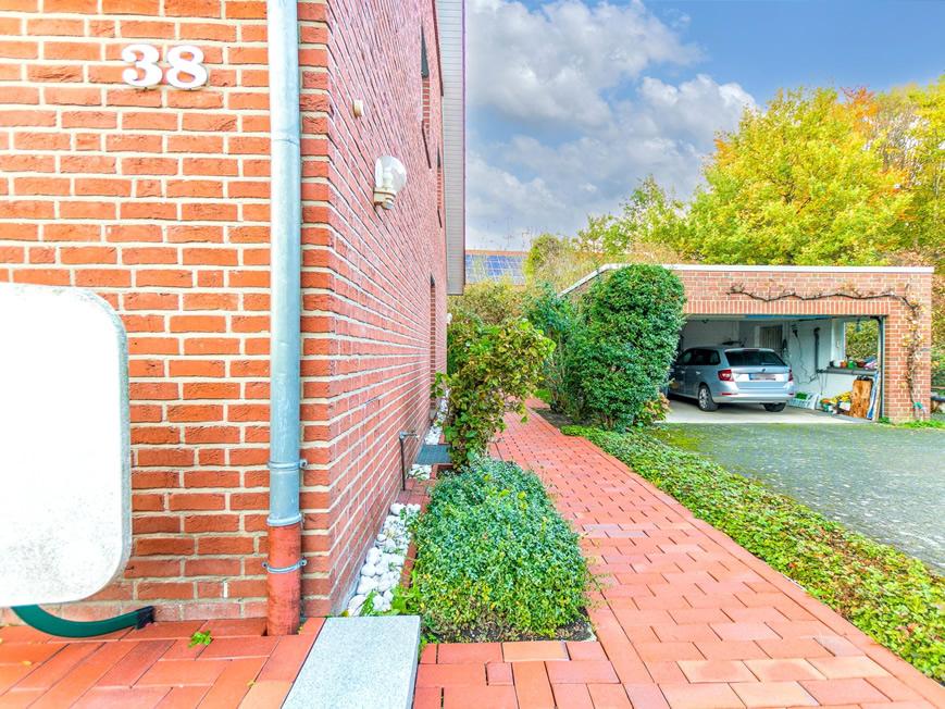 Das Grundstück ist ideal nach Süden ausgerichtet. An der westlichen Grenze befinden sich Carport und Abstellraum, zur Südseite Terrasse und Garten – sonnig, ruhig, gepflegt. Groß genug, damit Kinder sicher barfuß über den Rasen laufen können, Hunde herumtollen oder Sie sich mit einem Buch auf der Liege entspannen. Und dabei so pflegeleicht, dass Freizeit auch wirklich Freizeit bleibt.