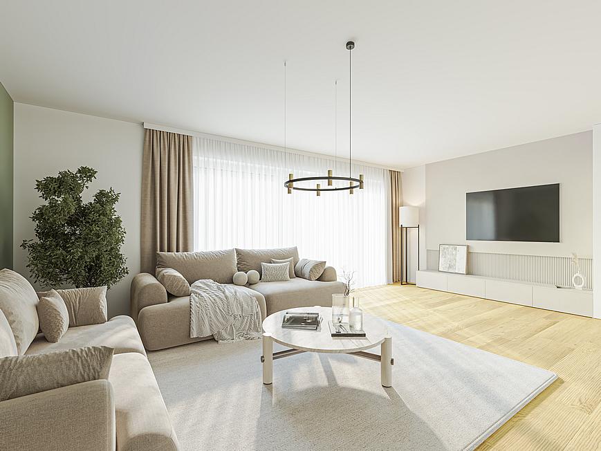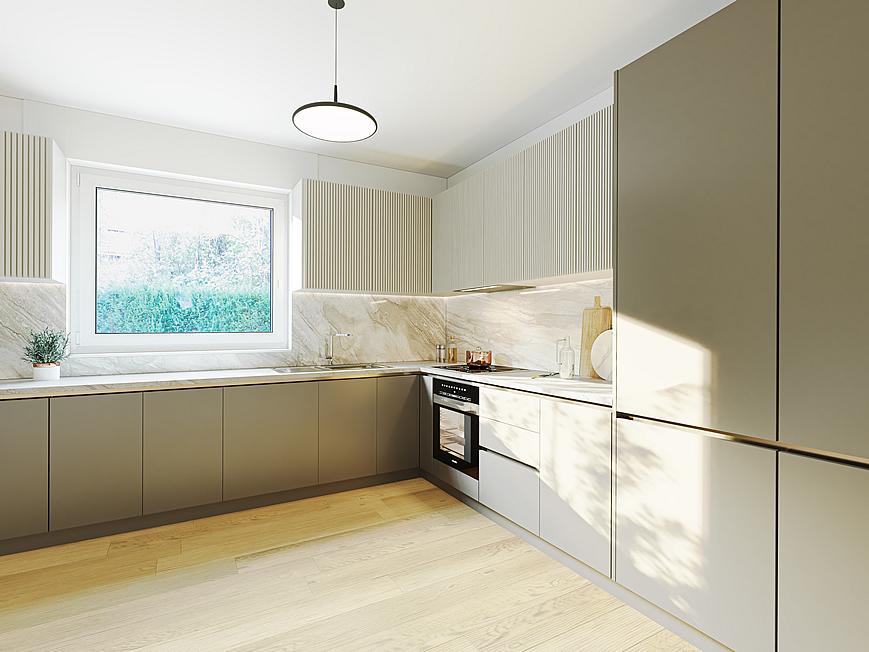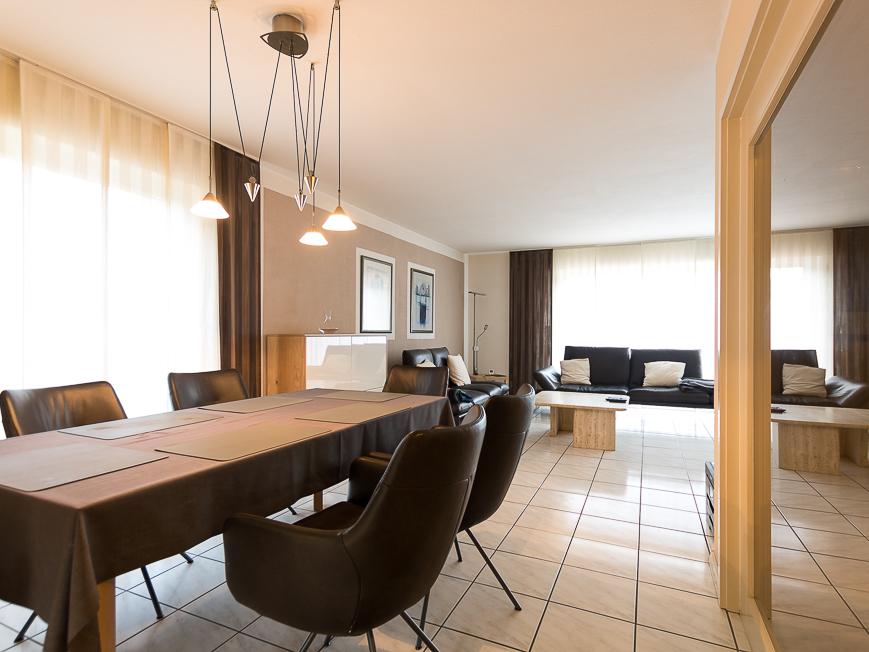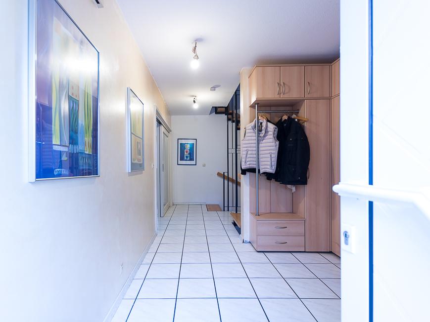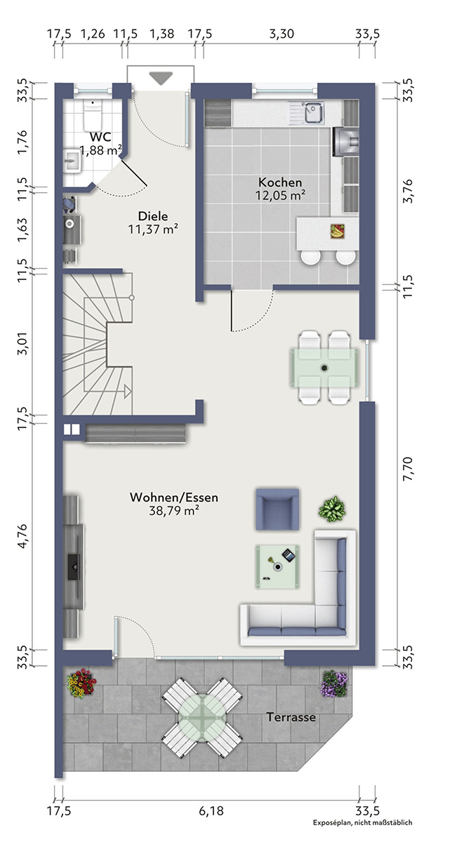 Im Inneren empfängt Sie der klassische Doppelhaushälften-Grundriss – perfekt für den Familienalltag. Die Diele bietet Platz für Garderobe und Schuhe, daneben die Küche: praktisch angebunden an den Essbereich, mit kurzen Wegen zum Decken des Esstischs. Der Wohn-Essbereich mit fast 40 m² ist großzügig geschnitten, hell und offen gestaltet. Hier entsteht der Mittelpunkt Ihres Familienlebens – mit Blick in den Garten, Eckcouch und Heimkinoanlage.