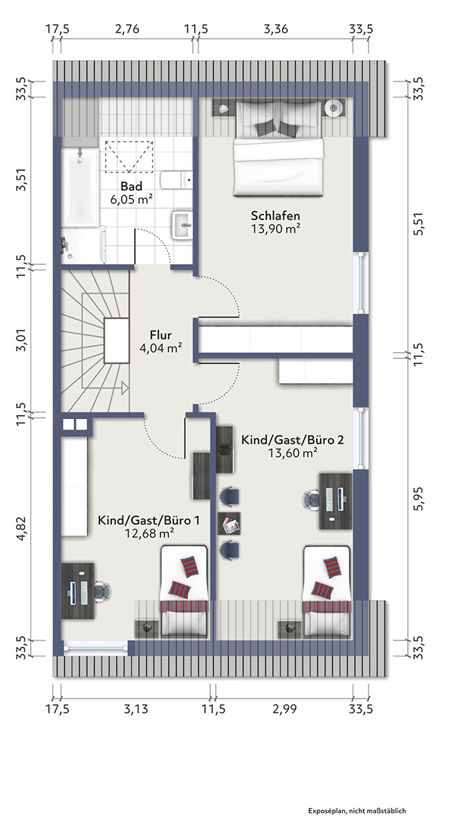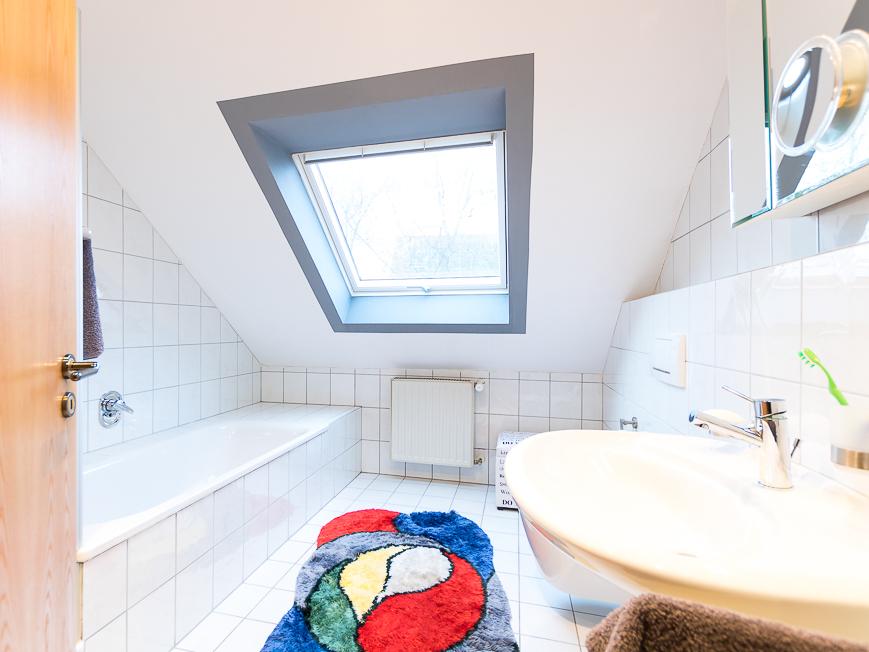 Im Obergeschoss finden sich drei gemütliche Rückzugsorte mit leichten Dachschrägen – zwei Kinderzimmer (ca. 13 m² und 14 m²) und ein Elternschlafzimmer (ca. 14 m²). Das Tageslichtbad ist hell und bietet Wanne wie Dusche – für den schnellen Morgen oder entspannte Schaumbäder am Abend. Das ausgebaute Dachstudio (ca. 10 m²) wird durch ein Giebelfenster belichtet und wartet nur darauf, von Ihnen mit Leben gefüllt zu werden.