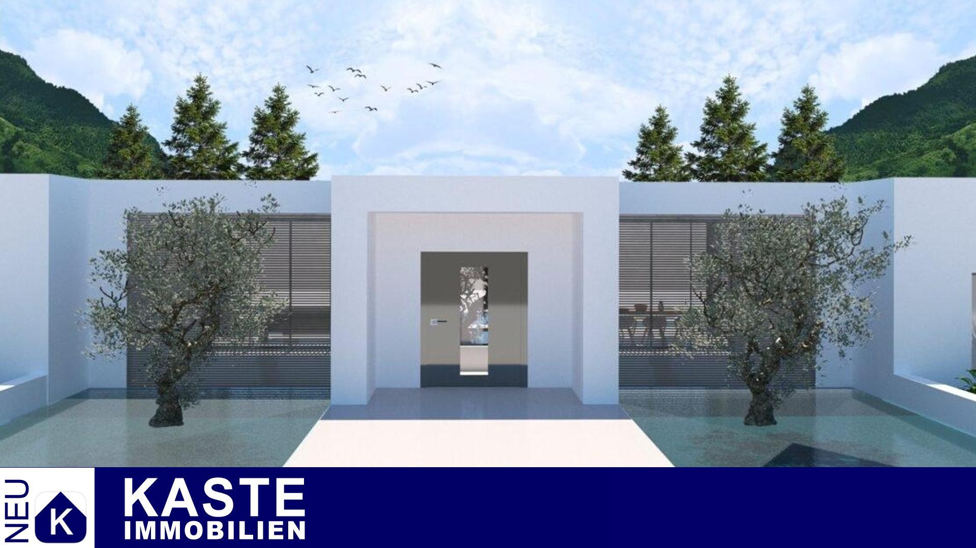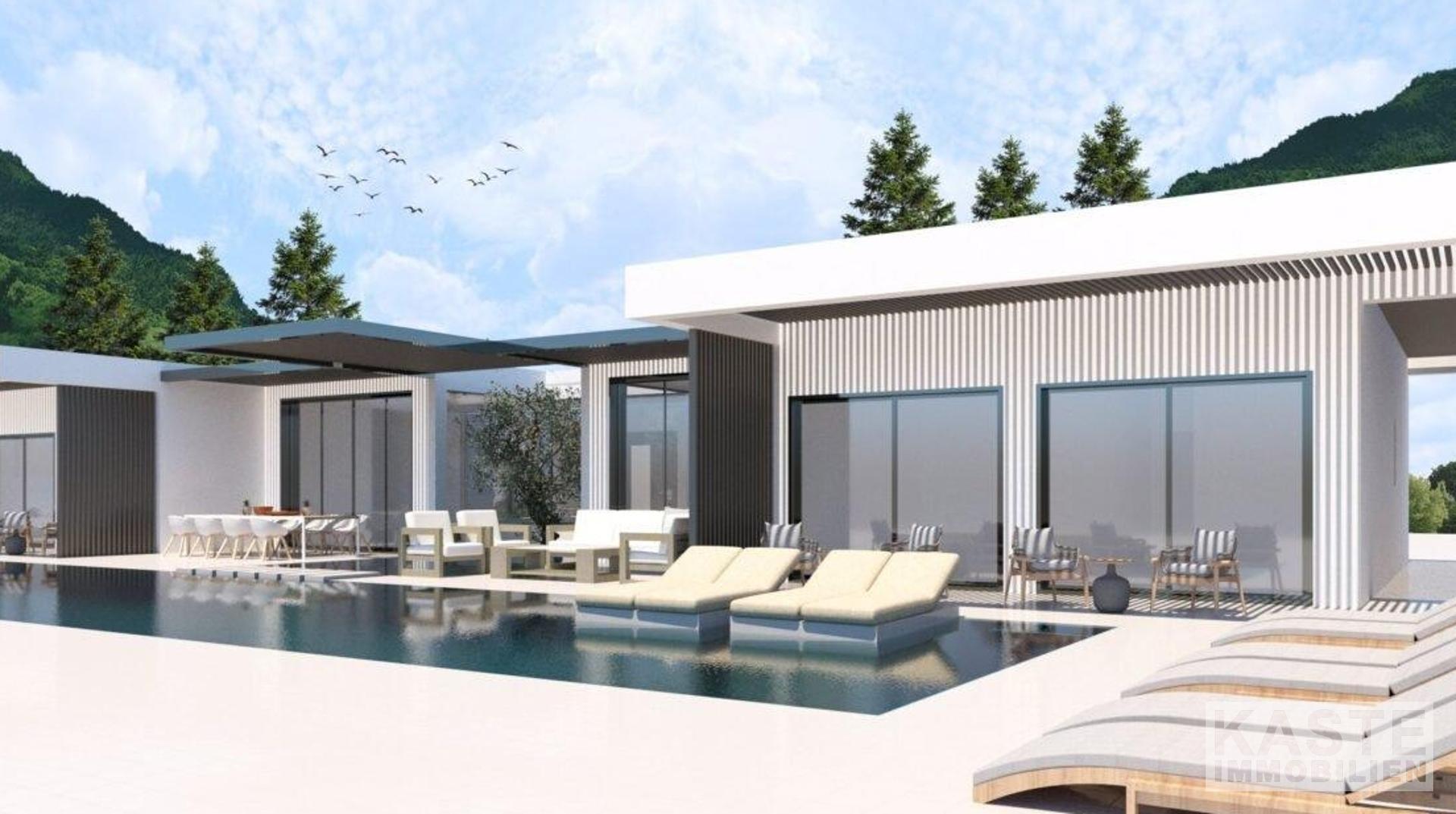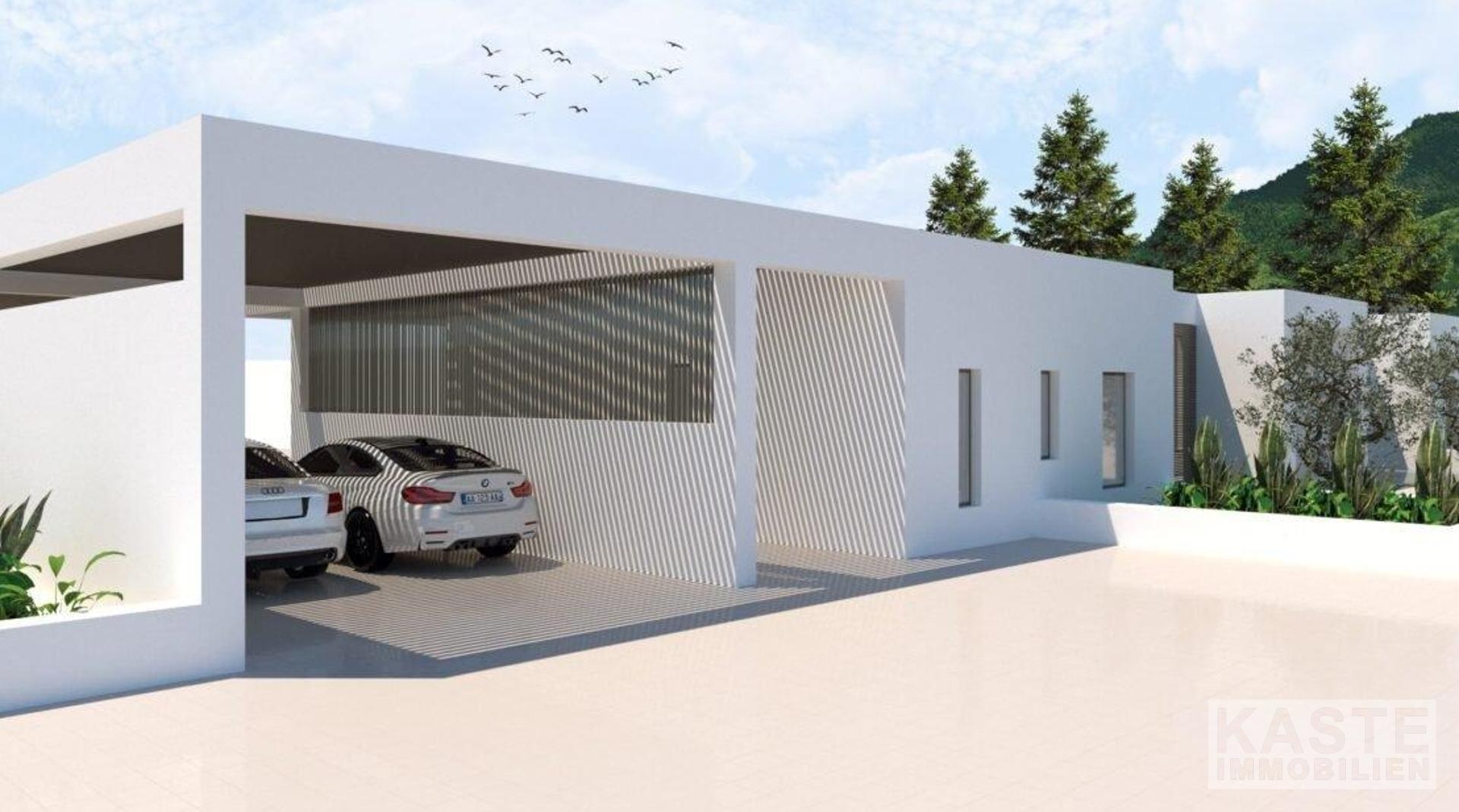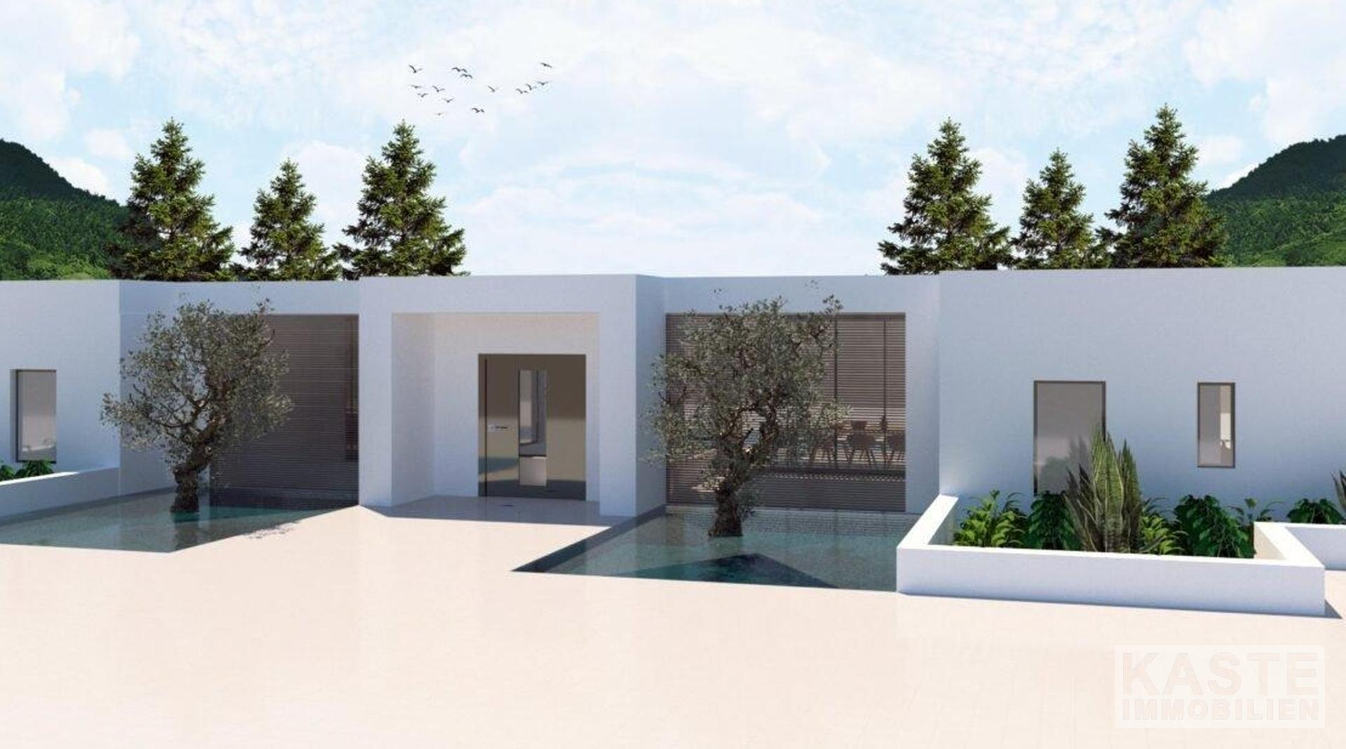 Die Villa: Auf einem mindestens 4.000 m² großen Grundstück in Hanglage bietet diese Villa reichlich Wohnraum. Der Bauträger hat spielerisch mit einem Wechsel von überdachten und nicht überdachten Bereichen in der gesamten Villa gearbeitet. Die Villa ermöglicht es, das atemberaubende Ionische Meer in das Haus zu holen. Der Wohnbereich der Villa ist ein offener Bereich, der in etwa die Küche, das Esszimmer und das Wohnzimmer umfasst. Das Wohnzimmer erstreckt sich zusammen mit dem Essbereich über fast die gesamte Fläche. Die Küche hat eine große Kochinsel, die eine räumliche Trennung ermöglicht und praktisch ist, da sie zusätzliche Arbeitsfläche bietet. Zwischen der Küche und der Kochinsel befindet sich eine Tür, die zu einer weiteren unbedeckten Grünfläche führt. Neben dem Essbereich befindet sich ein Atrium, das als Esszimmer im Freien genutzt wird.
