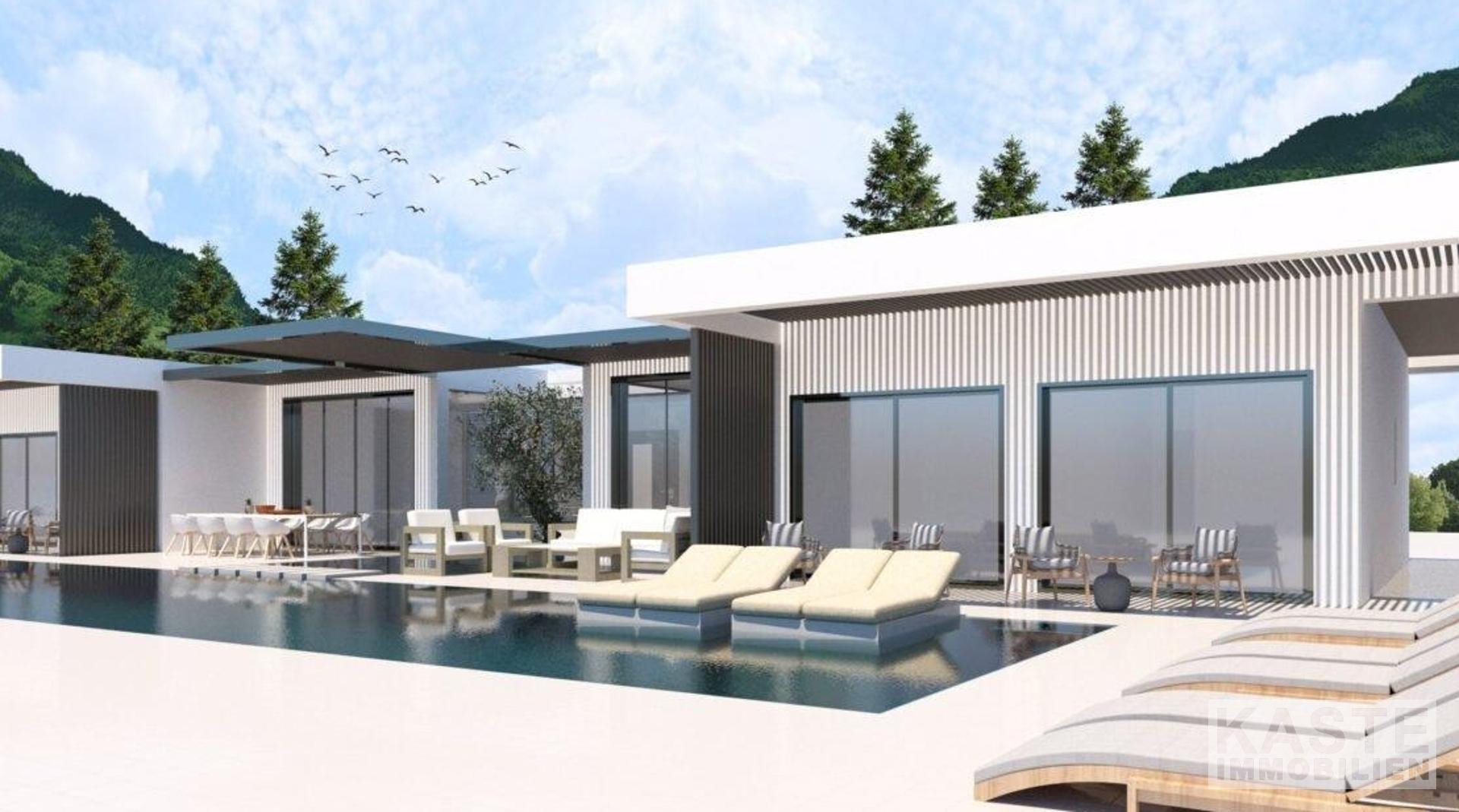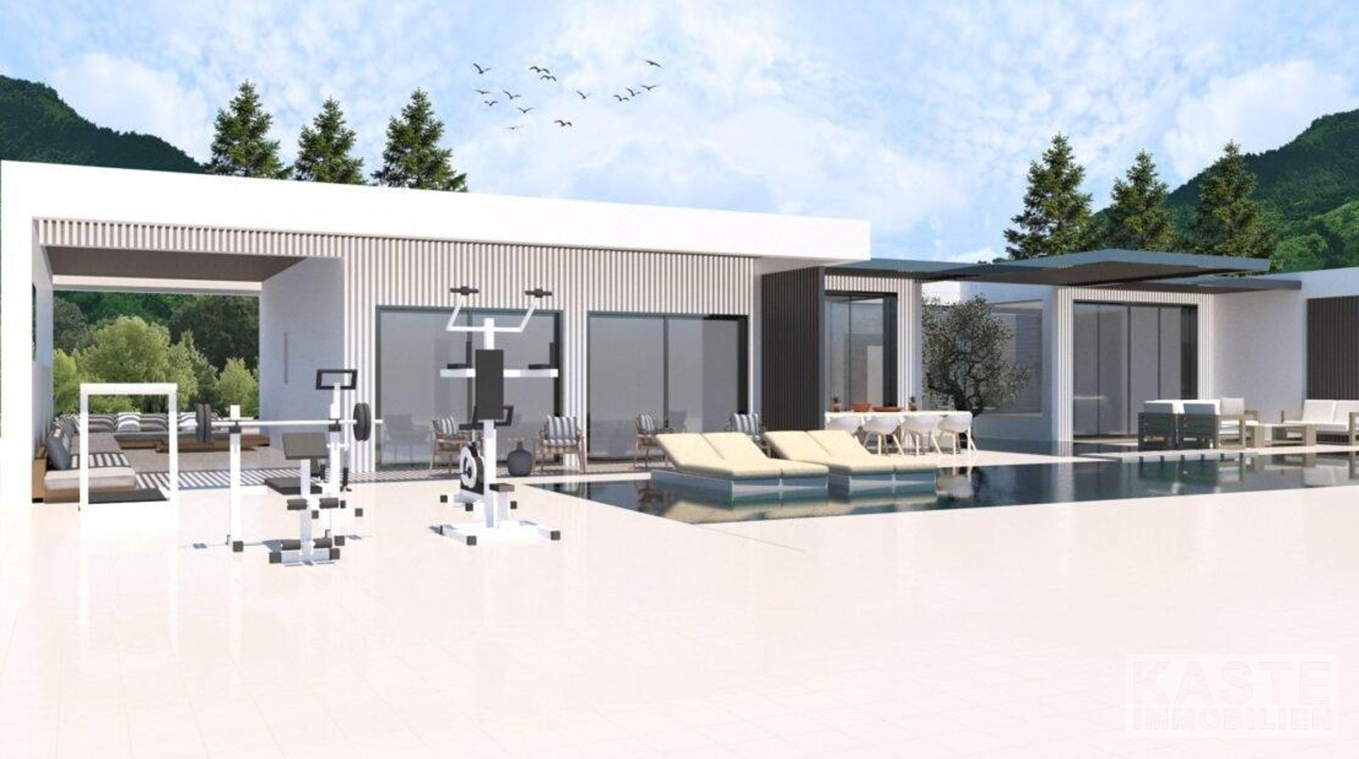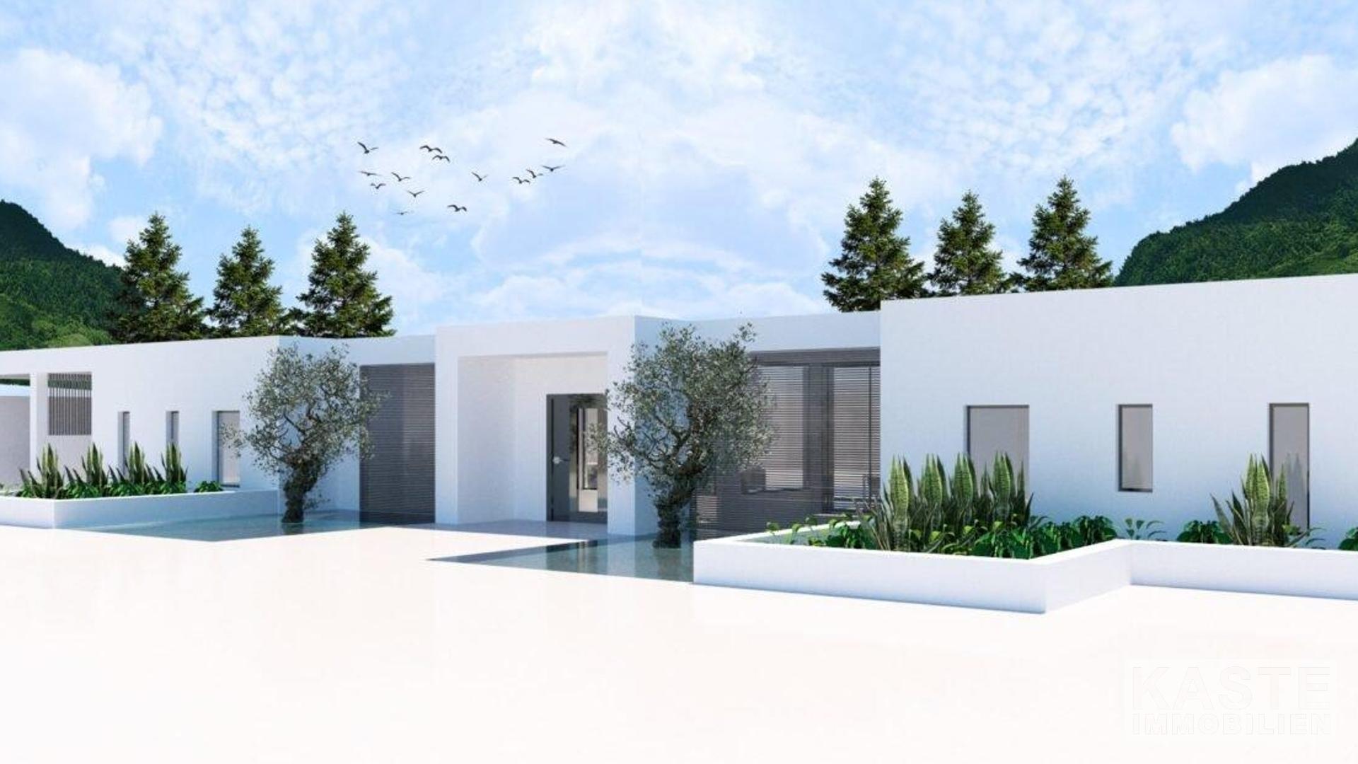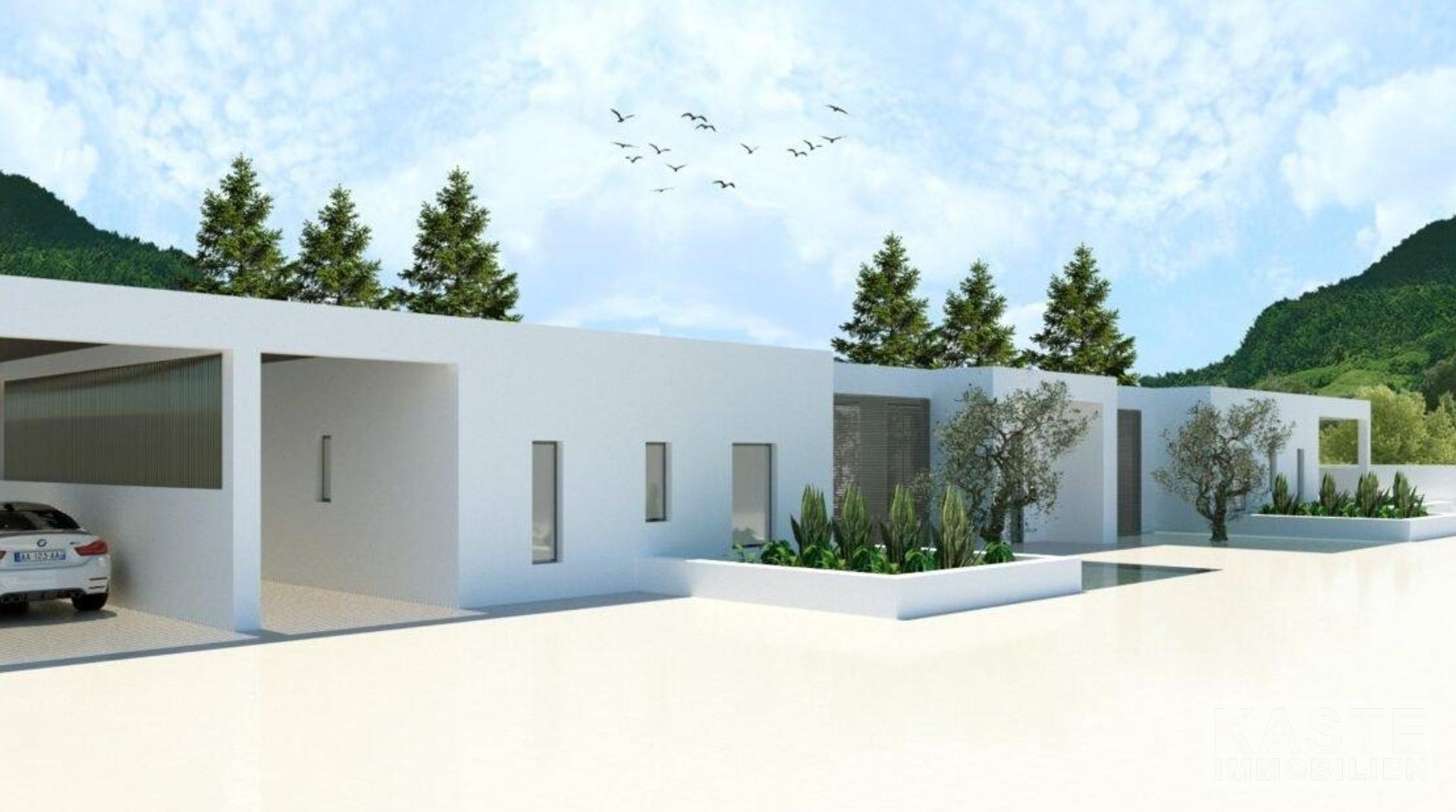 Die Villa: Auf einem mindestens 4.000 m² großen Grundstück in Hanglage bietet diese Villa reichlich Wohnraum. Der Bauträger hat spielerisch mit einem Wechsel von überdachten und nicht überdachten Bereichen in der gesamten Villa gearbeitet. Die Villa ermöglicht es, das atemberaubende Ionische Meer in das Haus zu holen. Der Wohnbereich der Villa ist ein offener Bereich, der in etwa die Küche, das Esszimmer und das Wohnzimmer umfasst. Das Wohnzimmer erstreckt sich zusammen mit dem Essbereich über fast die gesamte Fläche. Die Küche hat eine große Kochinsel, die eine räumliche Trennung ermöglicht und praktisch ist, da sie zusätzliche Arbeitsfläche bietet. Zwischen der Küche und der Kochinsel befindet sich eine Tür, die zu einer weiteren unbedeckten Grünfläche führt. Neben dem Essbereich befindet sich ein Atrium, das als Esszimmer im Freien genutzt wird.
