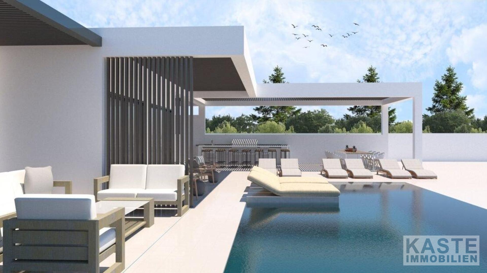 Außenbereich: Der Infinity-Pool mit Unterwasserbeleuchtung ist ein echter Blickfang und wirkt wie eine natürliche Fortsetzung des ionischen Meeres. Die Terrasse, die die Villa von einer Seite zur anderen umgibt, wird mit Keramikfliesen gepflastert. Die gleichen Fliesen werden auch für die Außendusche verwendet. Der Grillplatz wird komplett mit Wasser- und Stromanschlüssen sowie einem Waschbecken und Schränken ausgestattet sein.