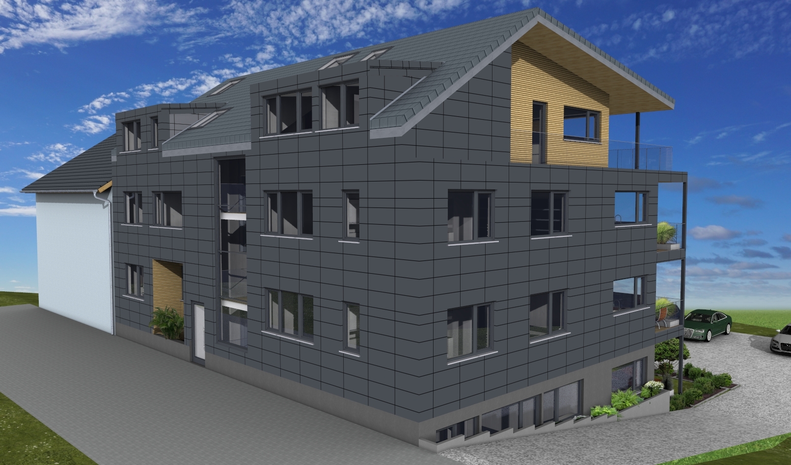 - Die Außenwände werden mit einer hochwertigen vorgehängten, hinterlüftenden und nahezu sanierungsfreien Fassade ausgeführt