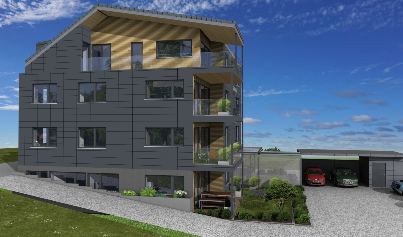 - Die Außenwände werden mit einer hochwertigen vorgehängten, hinterlüftenden und nahezu sanierungsfreien Fassade ausgeführt