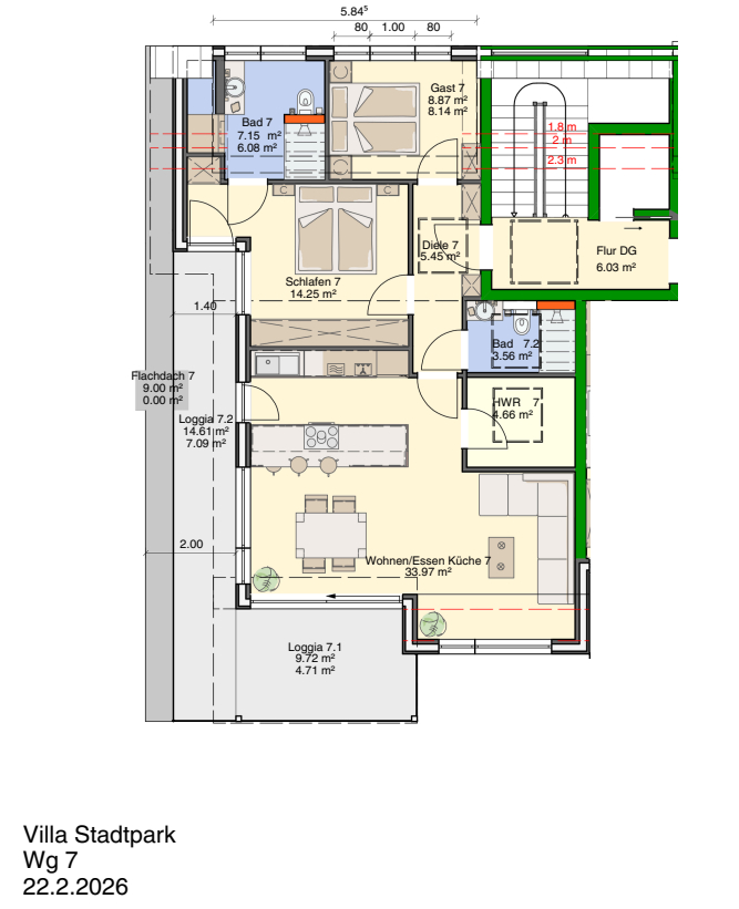Der offene Wohnbereich erstreckt sich über ca. 34 m² und überzeugt durch bodentiefe Fenster bzw. Schiebeelemente und einen direkten Balkonzugang. Zwei modern gestaltete Bäder sorgen für höchsten Komfort, während das Gästezimmer zusätzliche Annehmlichkeiten bietet. Der Hauswirtschaftsraum bietet ausreichend Stauraum und techniknahe Voraussetzungen. Die Sauna lädt zu entspannenden Wellnessmomenten ein.