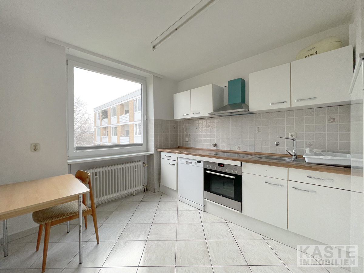 Die angrenzende Küche bietet ebenfalls Potenzial zur individuellen Gestaltung. Sie kann theoretisch komplett geöffnet werden, um einen noch großzügigeren, luftigen Raum zu schaffen. Alternativ lässt sich die Verbindung durch einen Raumteiler flexibel gestalten, sodass Sie die Küche je nach Wunsch offen oder abgetrennt nutzen können – ganz nach Ihrem persönlichen Stil. Drittes Zimmer für flexible Nutzung