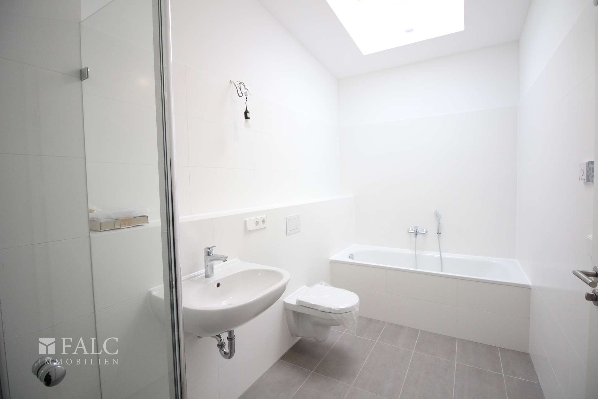 Das Badezimmer mit Badewanne und separater Dusche ist zeitlos hell gefliest. Zusätzlich gibt es ein Gäste-WC für Besucher. Die Sanitäranlagen sind von Villeroy und Boch. Das Badezimmer verfügt über Vellux Dachfenster.
