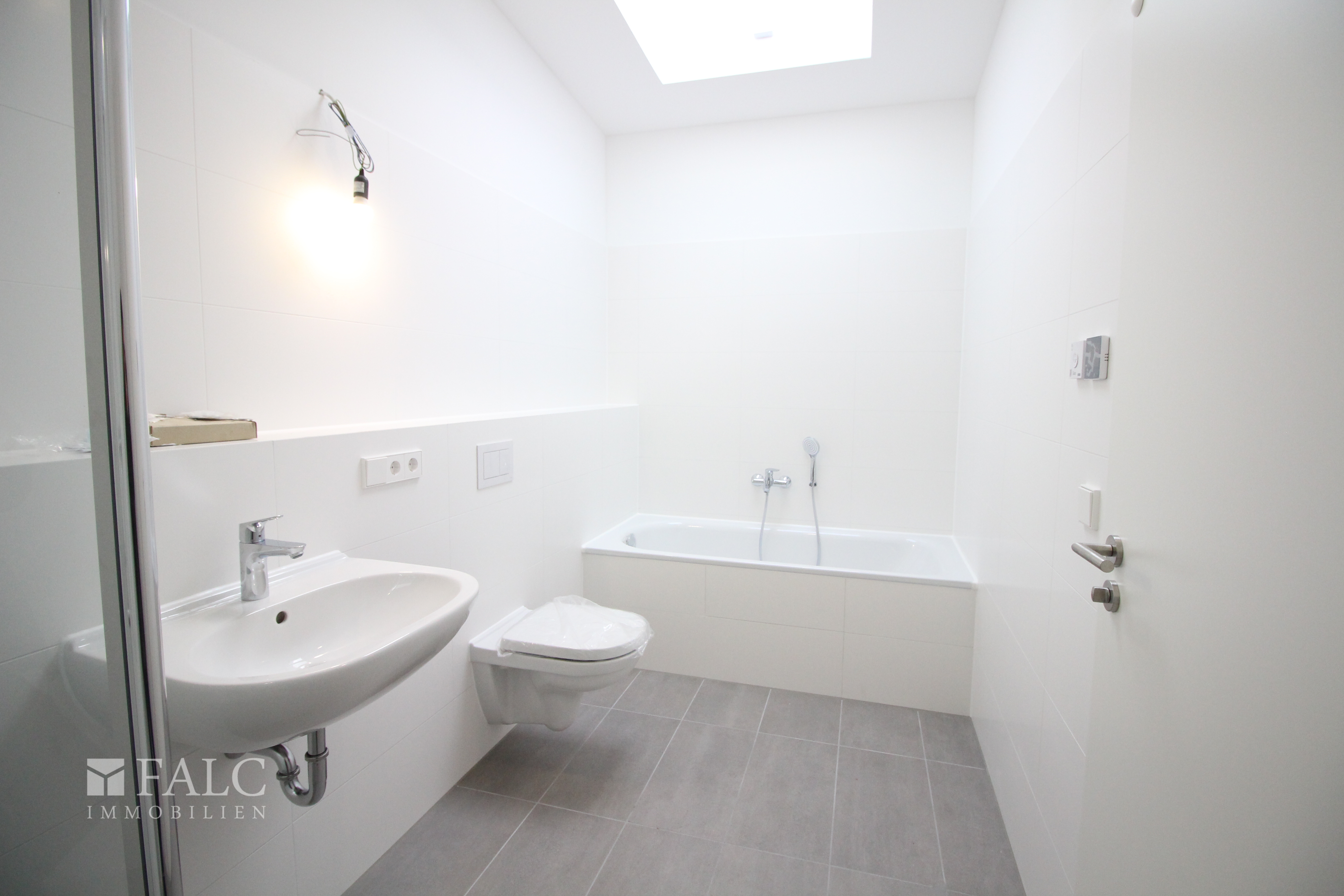 Das Badezimmer mit Badewanne und separater Dusche ist zeitlos hell gefliest. Zusätzlich gibt es ein Gäste-WC für Besucher. Die Sanitäranlagen sind von Villeroy und Boch. Das Badezimmer verfügt über Vellux Dachfenster.