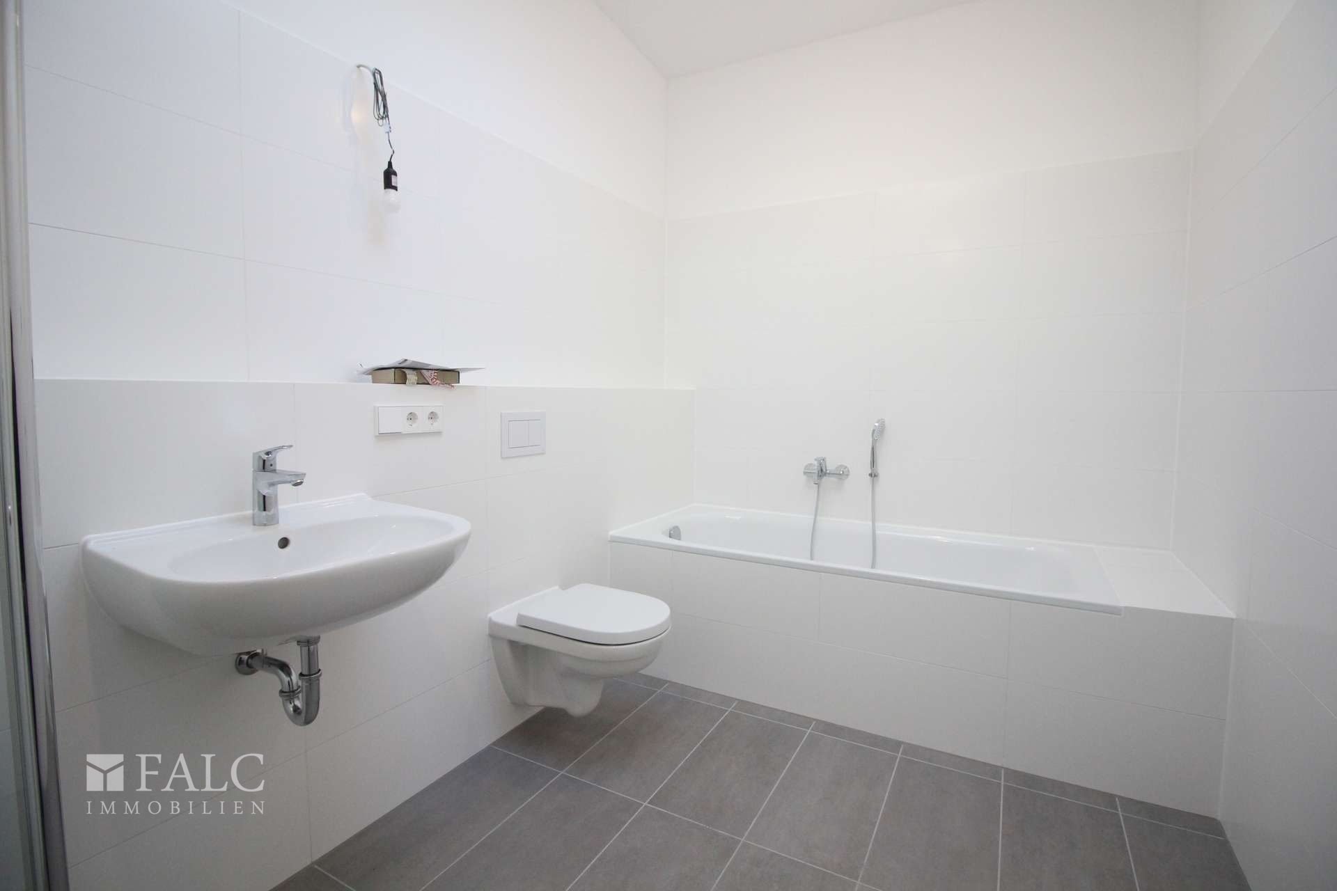 Das Badezimmer mit Badewanne und separater Dusche ist zeitlos hell gefliest. Zusätzlich gibt es ein Gäste-WC für Besucher. Die Sanitäranlagen sind von Villeroy und Boch. Das Badezimmer verfügt über Vellux Dachfenster.