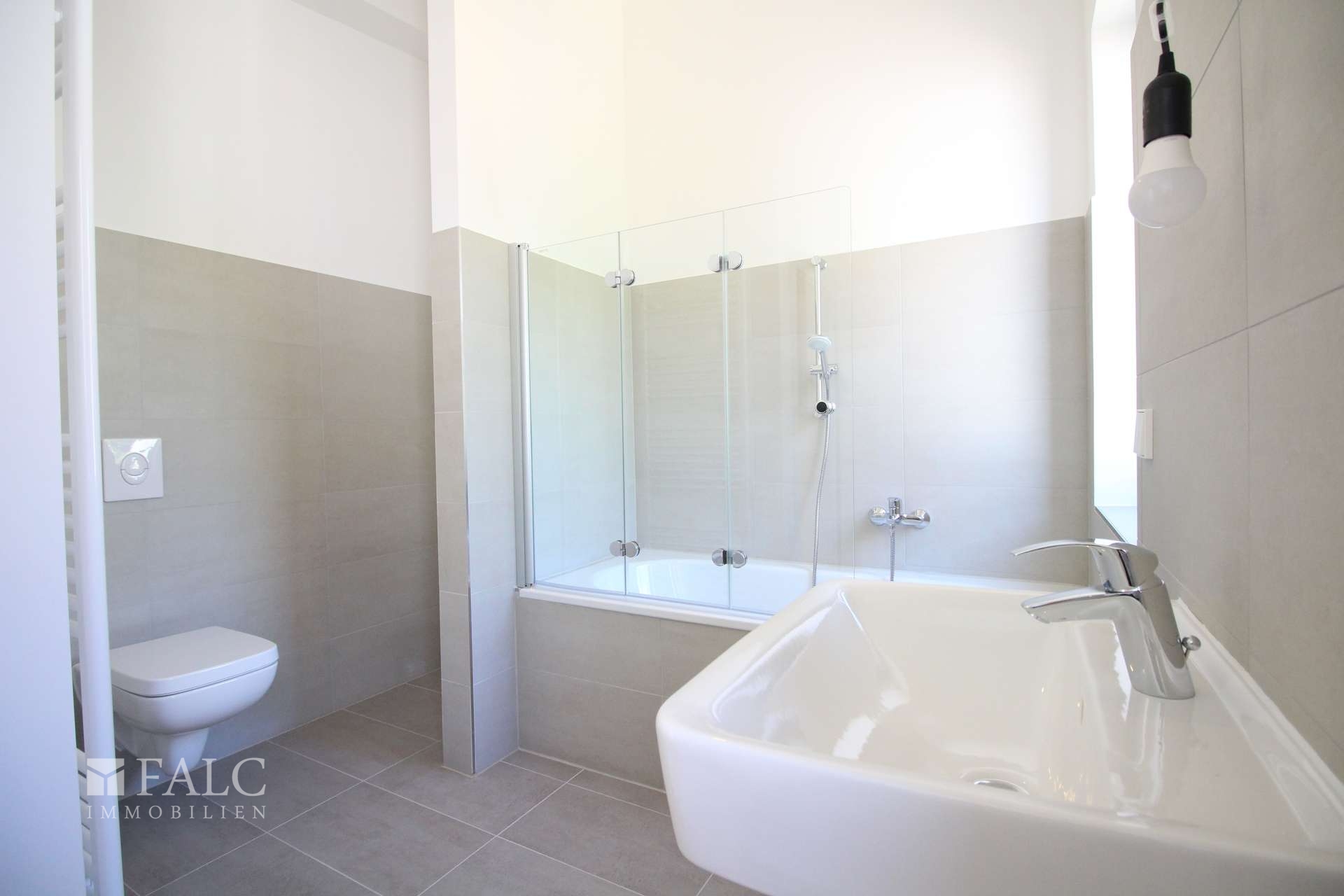 Das Badezimmer mit Badewanne ist zeitlos hell gefliest. Zusätzlich gibt es ein Gäste-WC für Besucher.