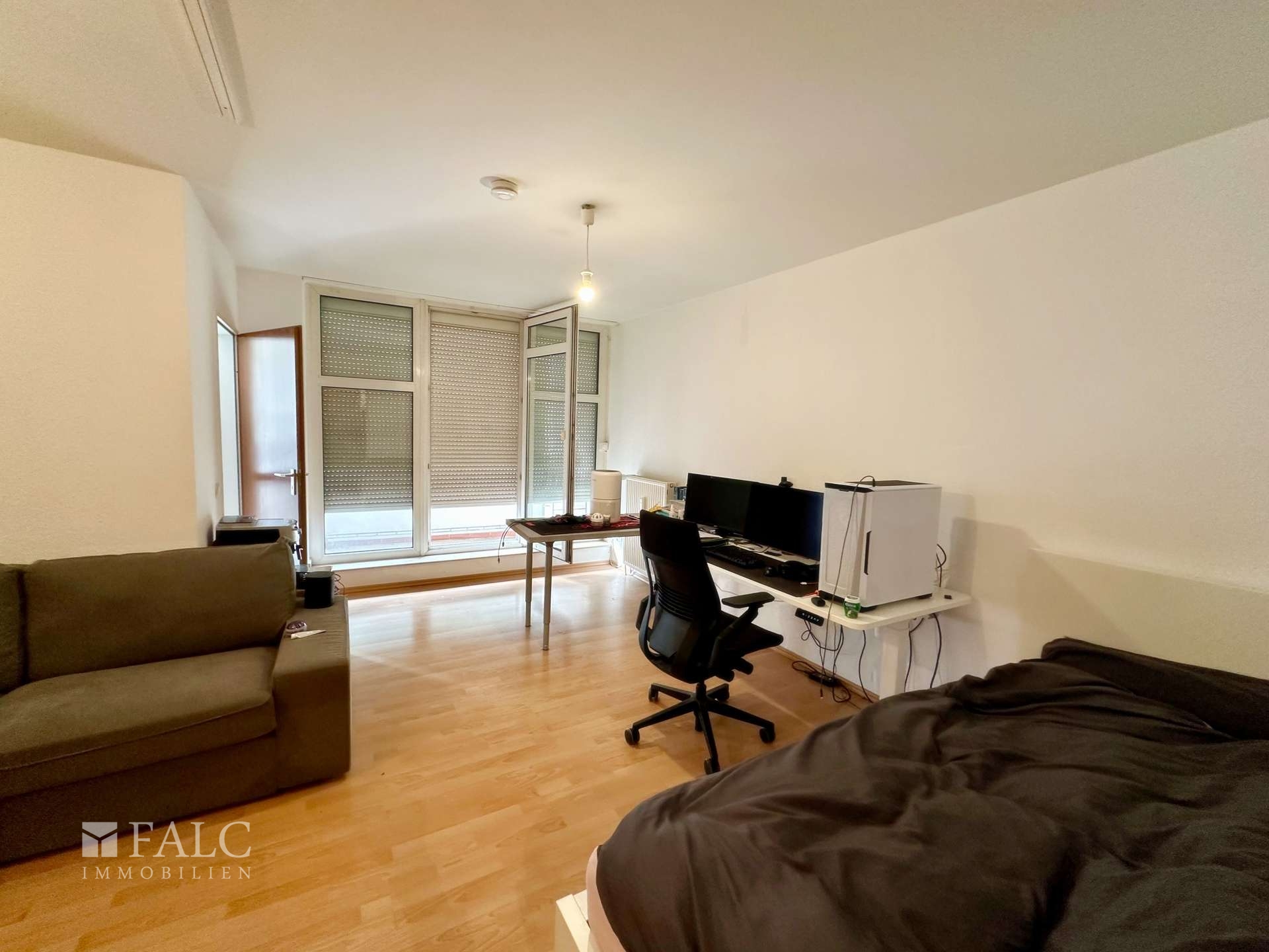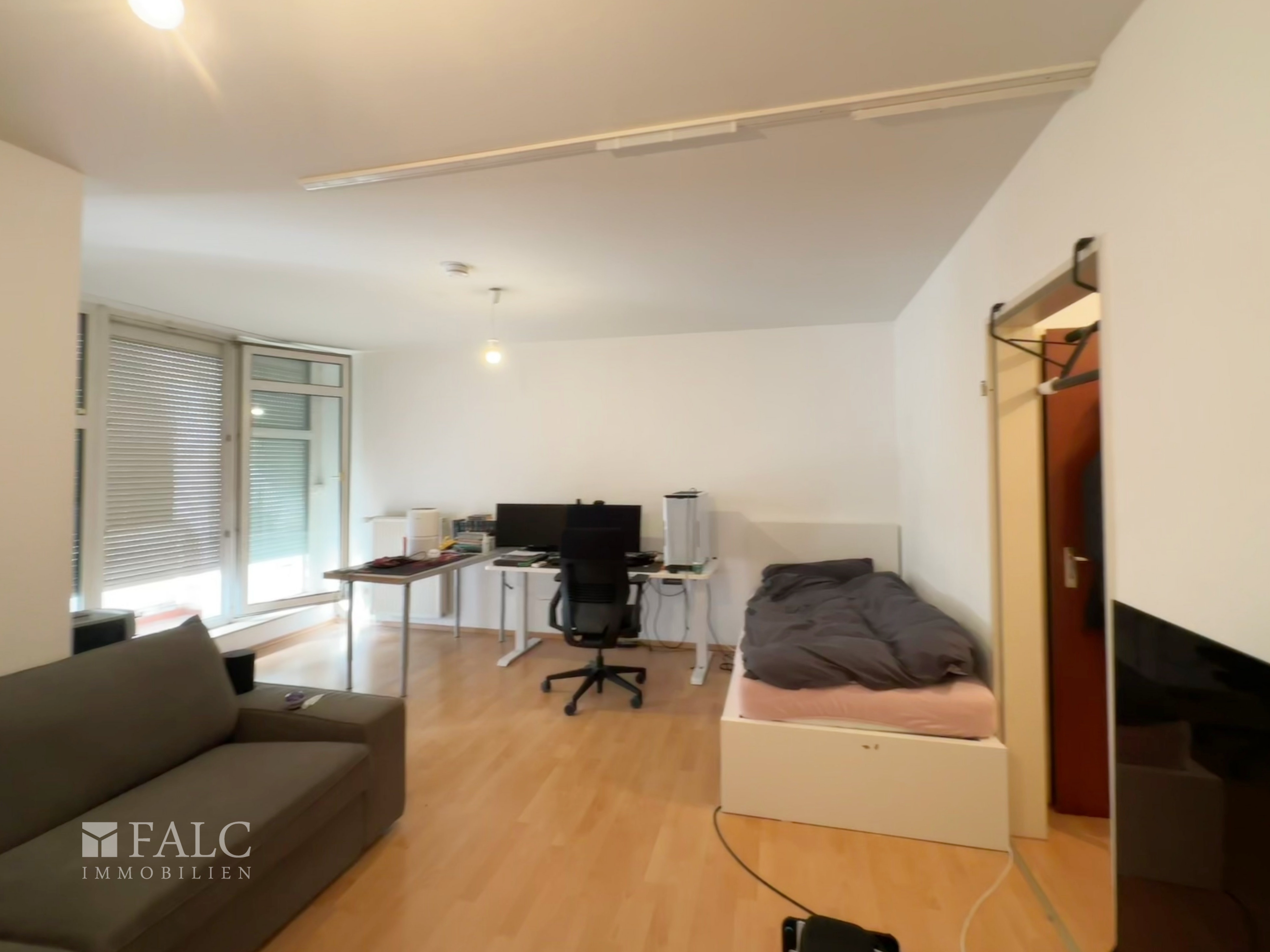 Der offene Wohn- und Schlafbereich wird durch große Fensterfronten mit viel Tageslicht versorgt. Hier ist ausreichend Platz für eine gemütliche Wohnlandschaft sowie einen separaten Schlafbereich. Der angrenzende Balkon erweitert den Wohnraum nach draußen und lädt zum Entspannen ein.