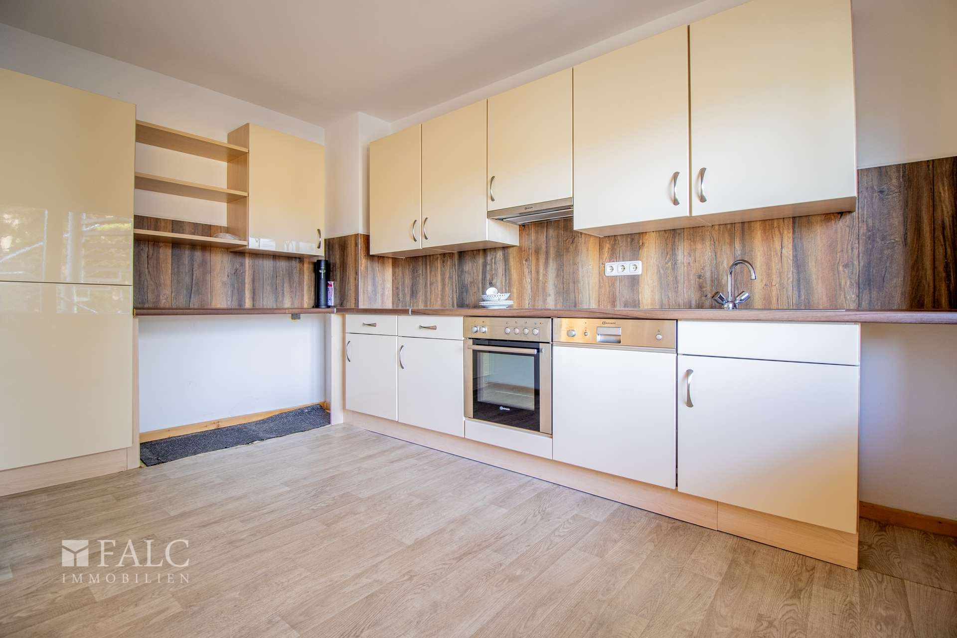 Zu Ihrer Rechten gelangen Sie in die separate Küche und in das Badezimmer. Die Küche bietet genügend Platz für einen Essbereich. Ihr modernisiertes Badezimmer überzeugt mit einem Tageslichtfenster sowie einer begehbaren Dusche.