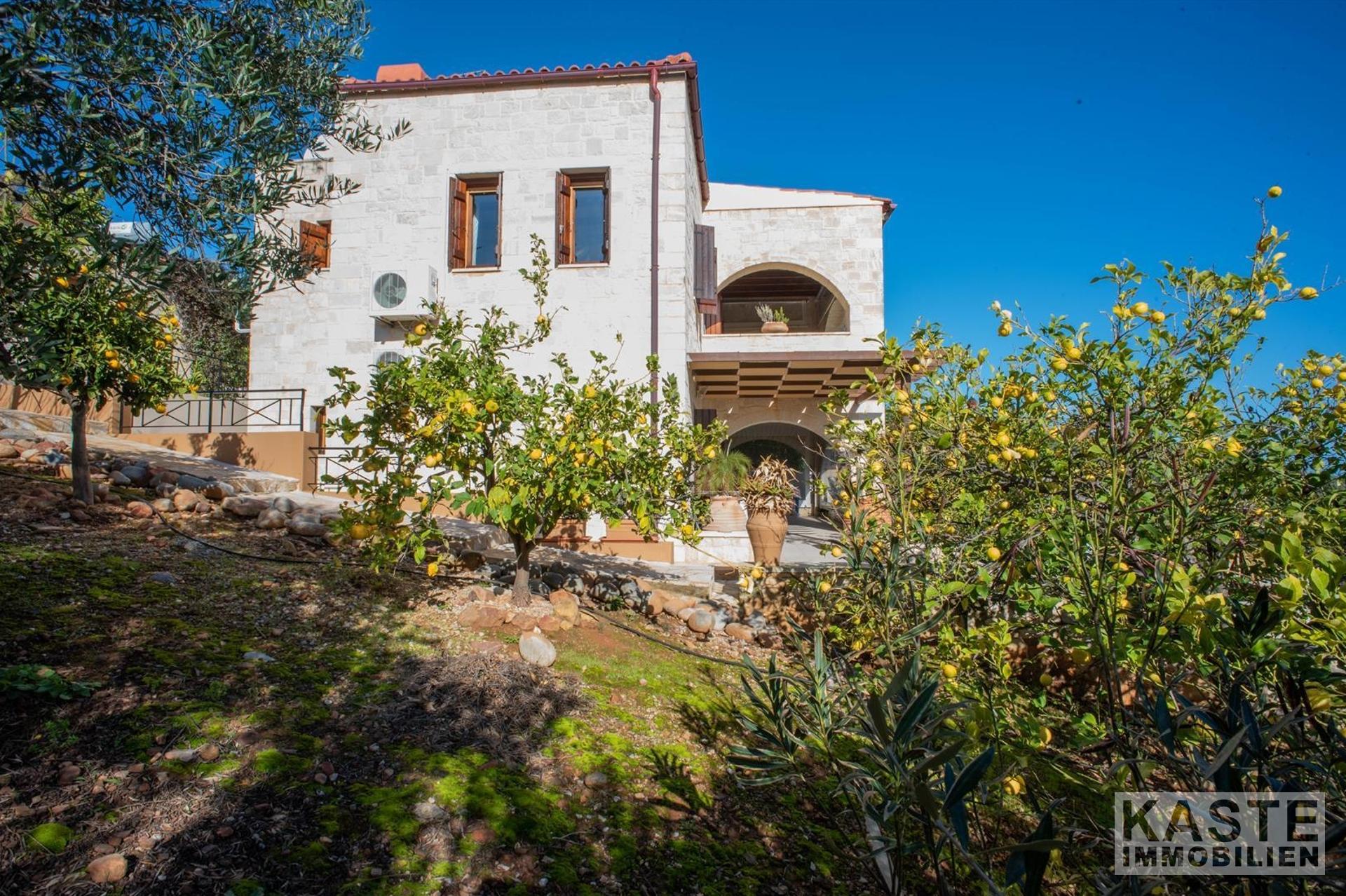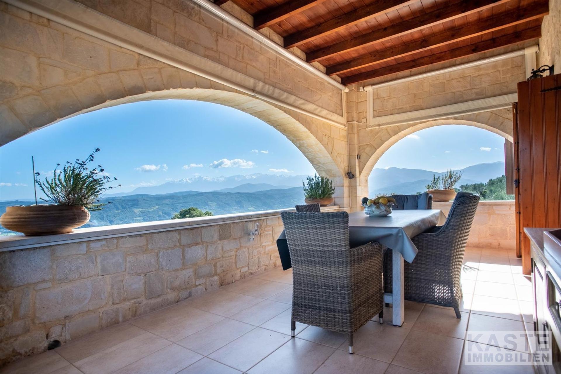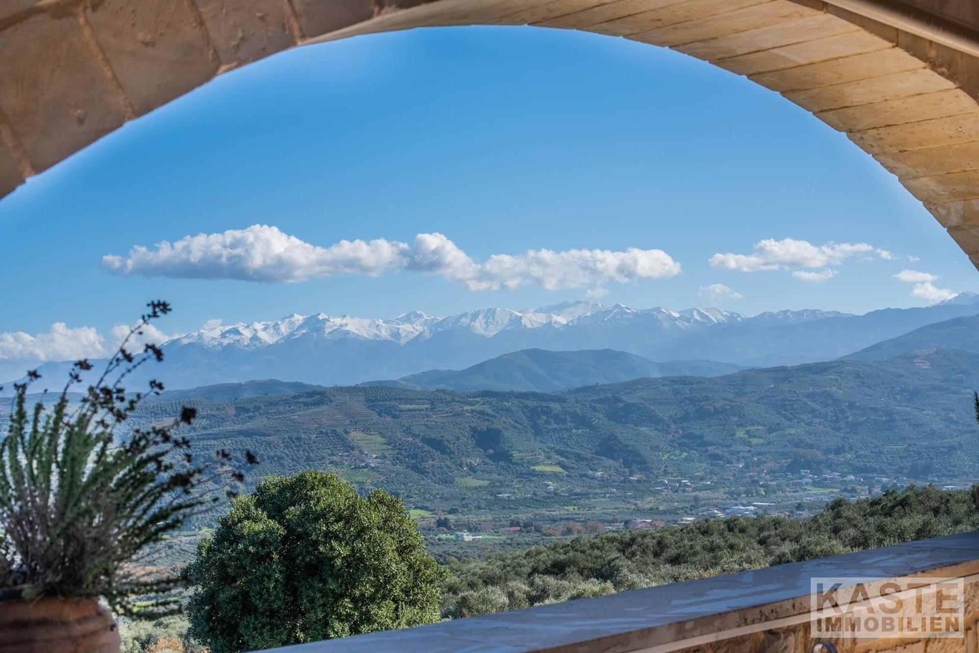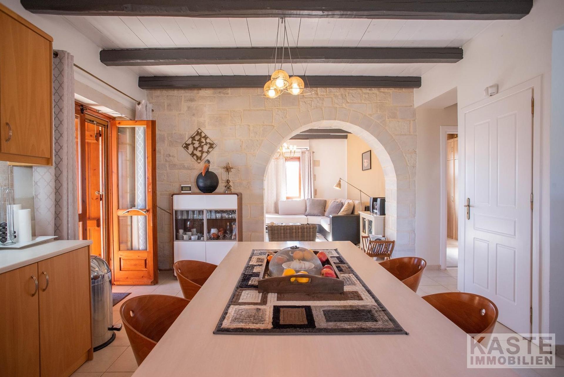 Im Inneren beeindruckt die Villa durch charakteristische Steinbögen und stilvolle Holzdecken, die dem Haus eine warme, authentische Atmosphäre verleihen. Eine großzügige Terrasse im Obergeschoss eröffnet einen atemberaubenden, ungehinderten Blick auf das azurblaue Meer und die majestätischen Weißen Berge.