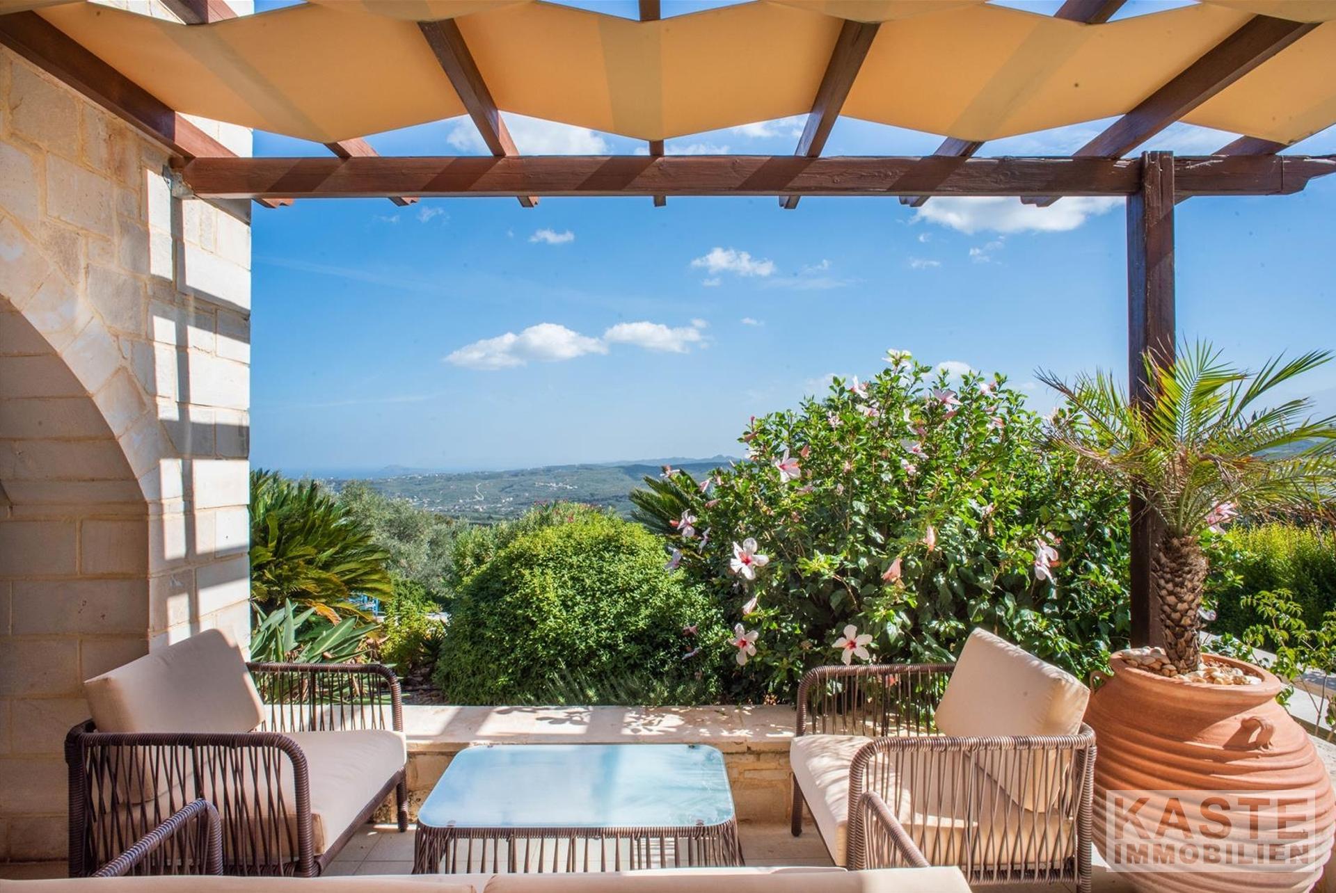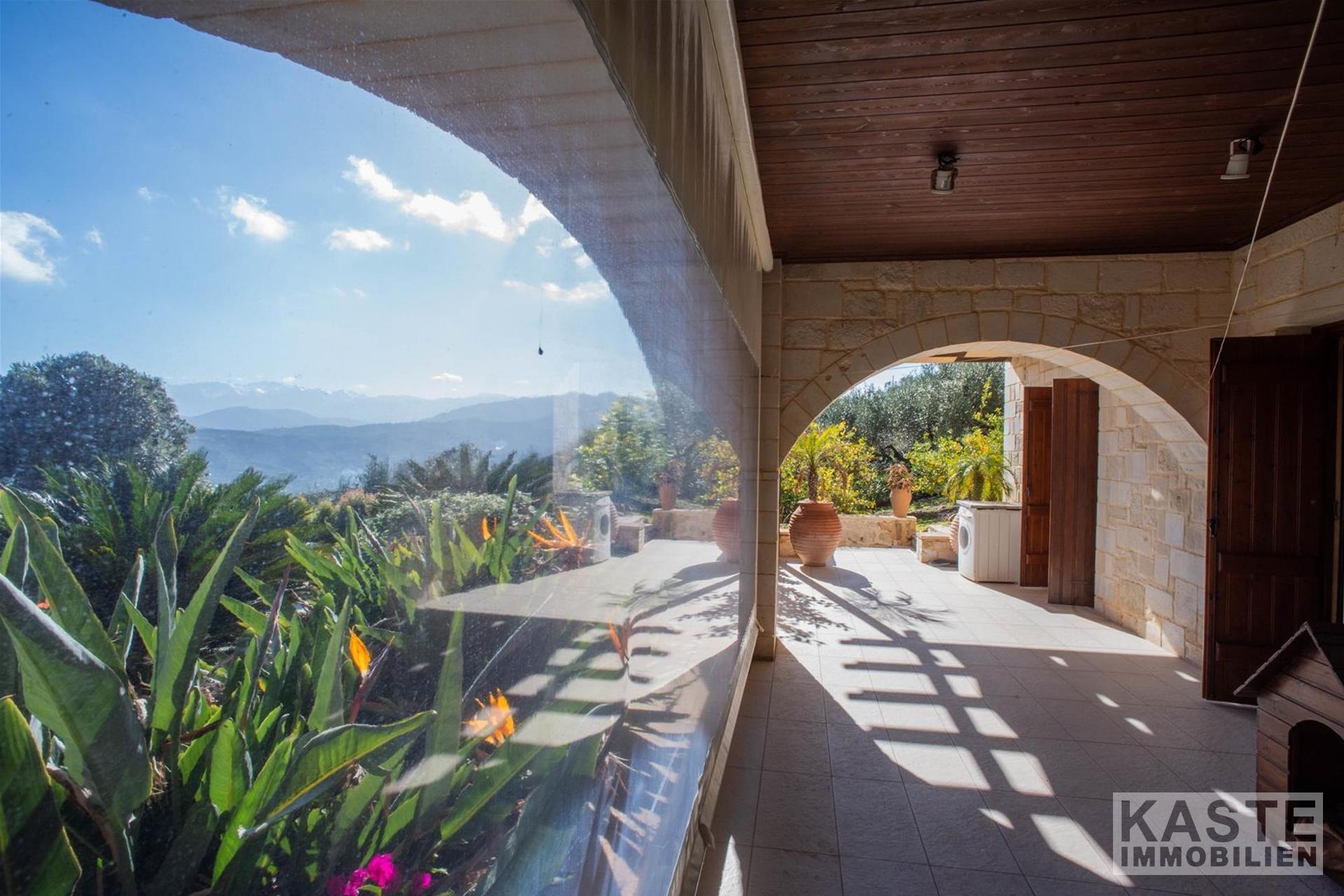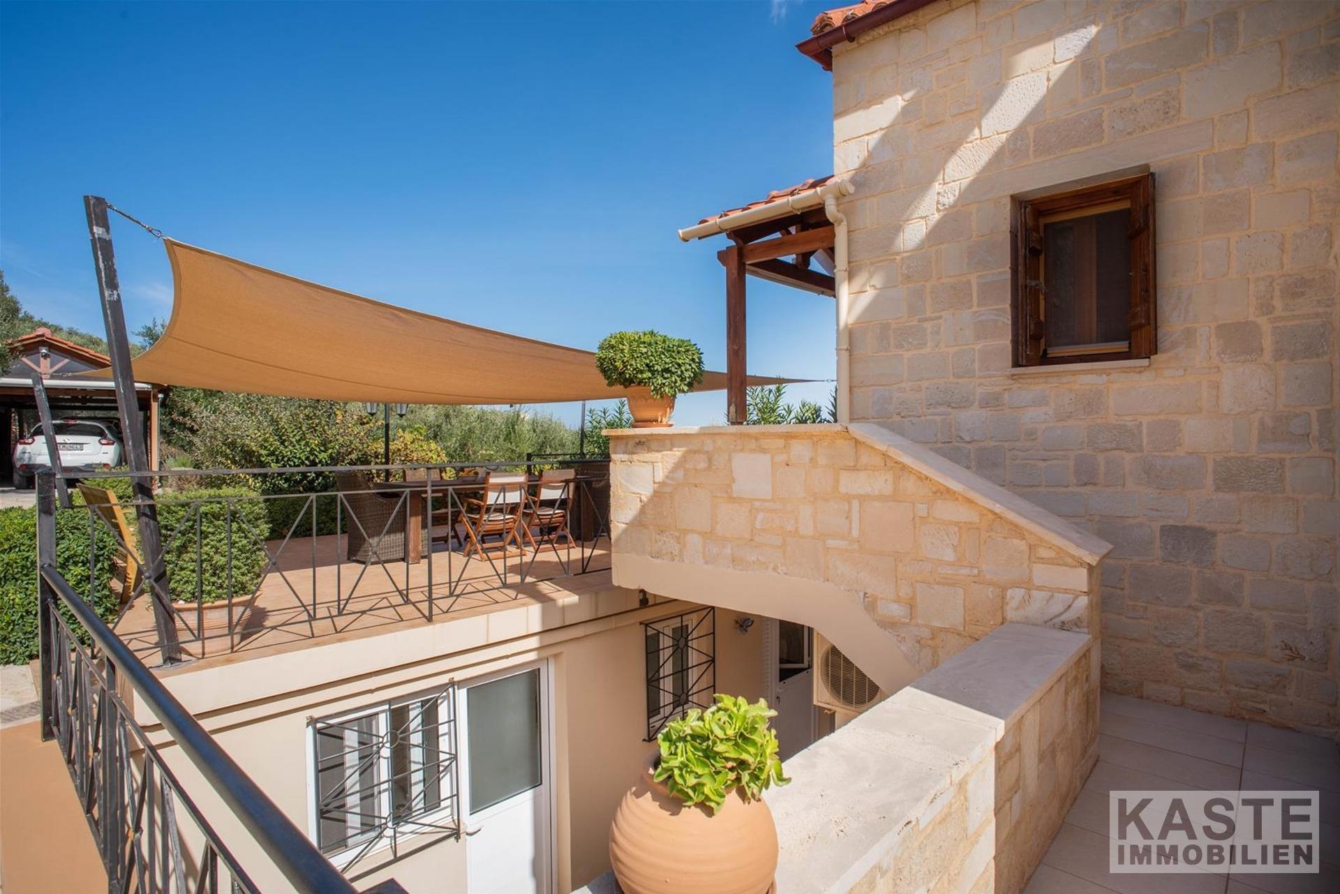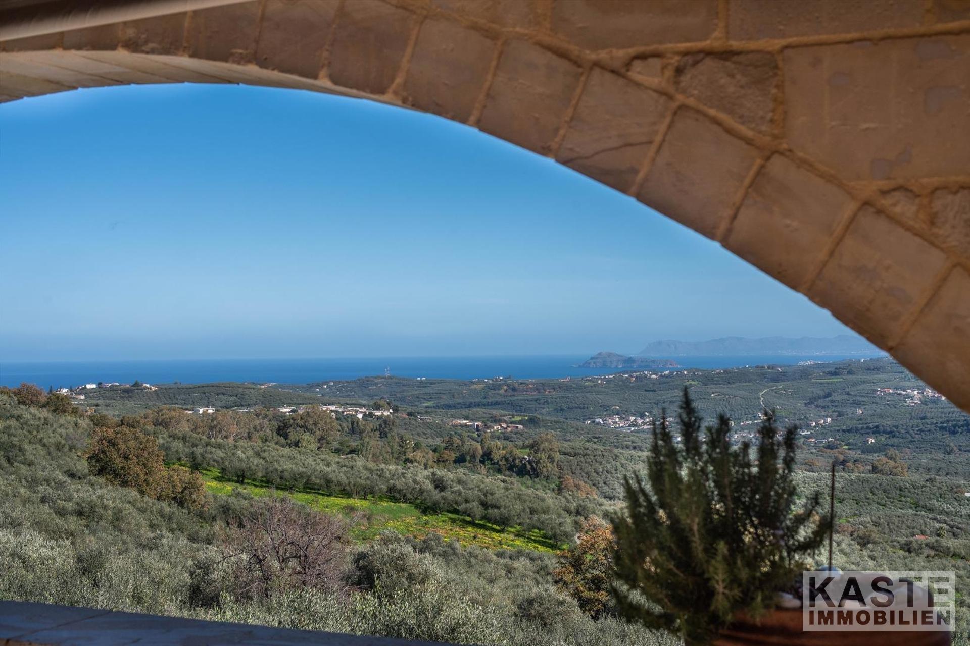 Im Inneren beeindruckt die Villa durch charakteristische Steinbögen und stilvolle Holzdecken, die dem Haus eine warme, authentische Atmosphäre verleihen. Eine großzügige Terrasse im Obergeschoss eröffnet einen atemberaubenden, ungehinderten Blick auf das azurblaue Meer und die majestätischen Weißen Berge.
