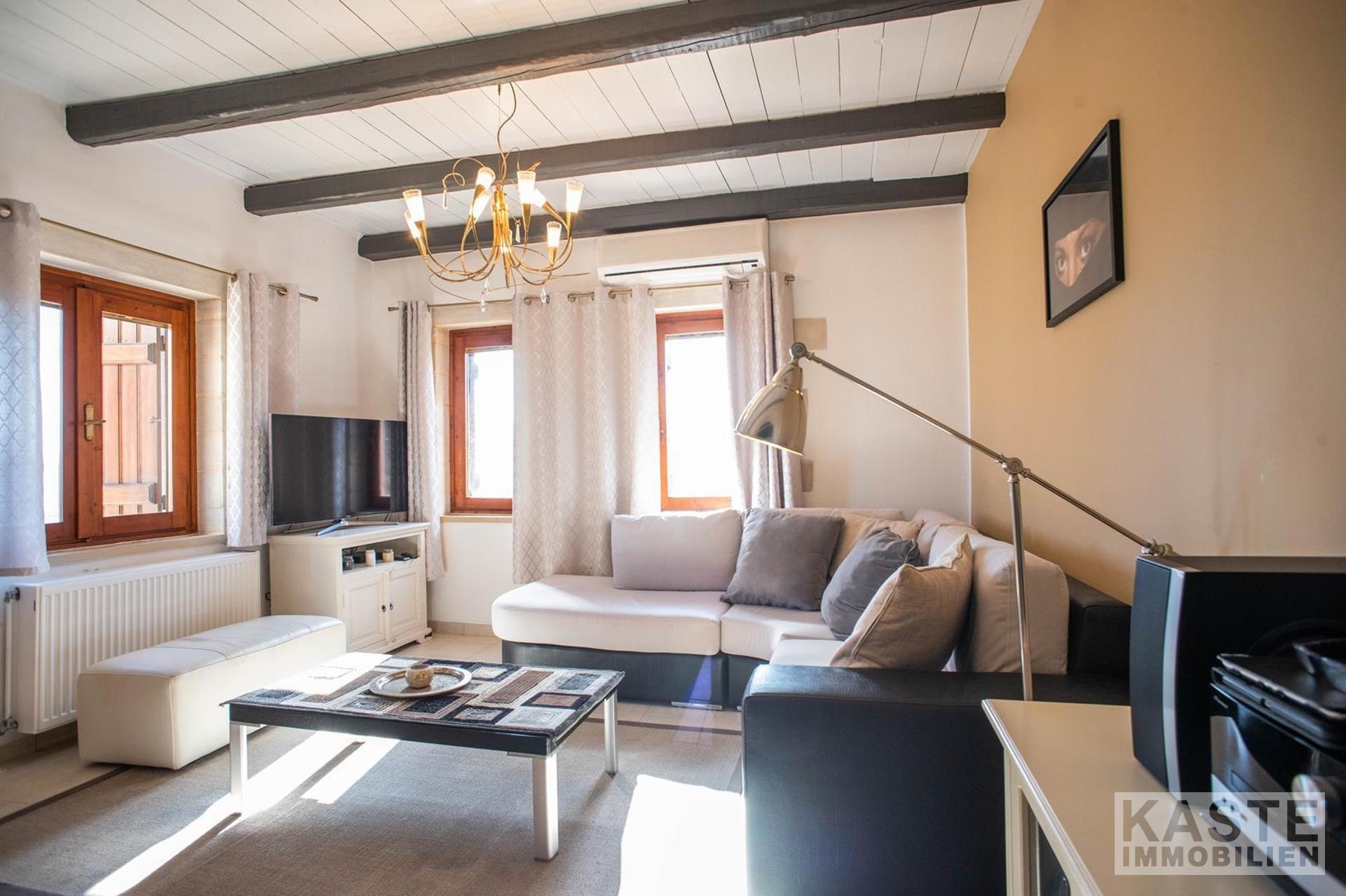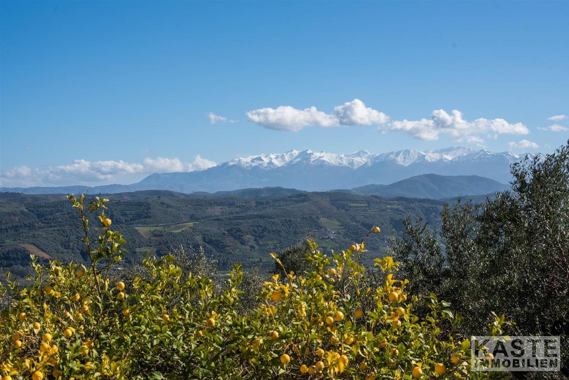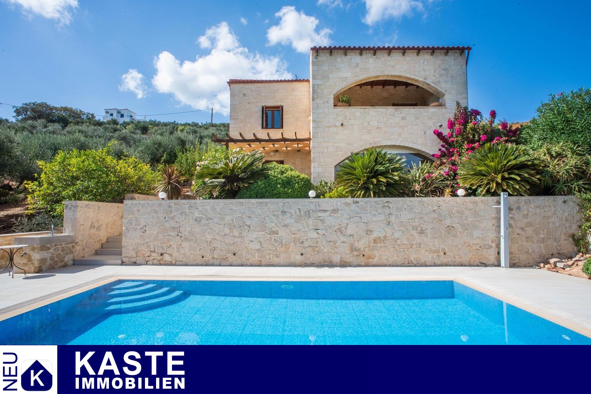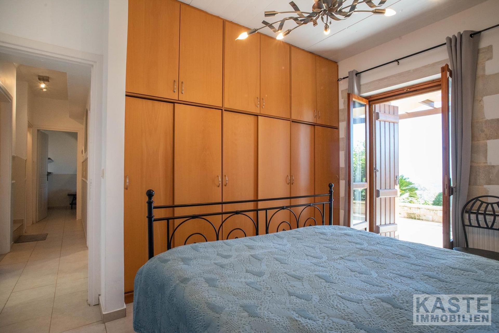 Im Inneren beeindruckt die Villa durch charakteristische Steinbögen und stilvolle Holzdecken, die dem Haus eine warme, authentische Atmosphäre verleihen. Eine großzügige Terrasse im Obergeschoss eröffnet einen atemberaubenden, ungehinderten Blick auf das azurblaue Meer und die majestätischen Weißen Berge.