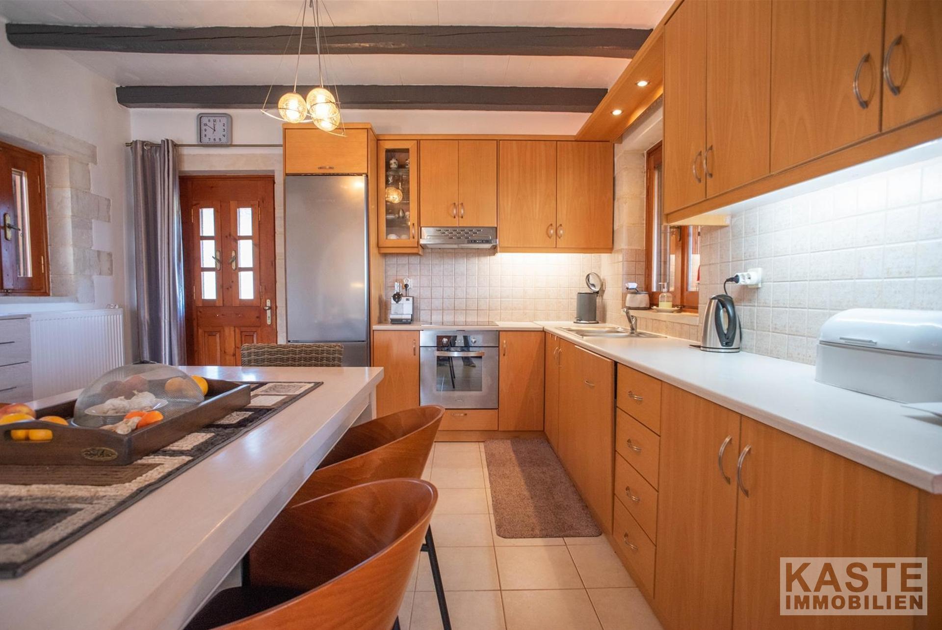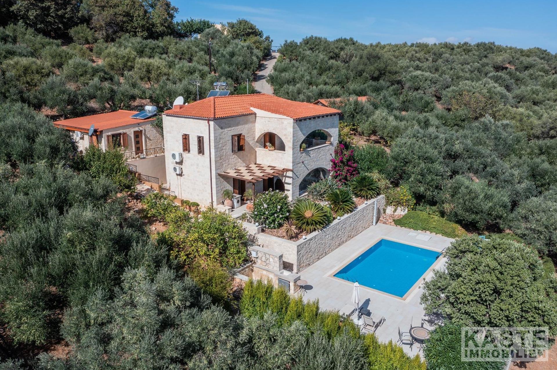 Diese charmante Steinvilla in Vouves bei Kolymbari bietet eine ideale Kombination aus traditioneller Architektur und modernen Annehmlichkeiten. Auf einem großzügigen Privatgrundstück von 4.941 m² gelegen, erstreckt sich die Wohnfläche der Villa über 205 m² und umfasst drei Schlafzimmer, zwei Badezimmer sowie zwei separate WCs.