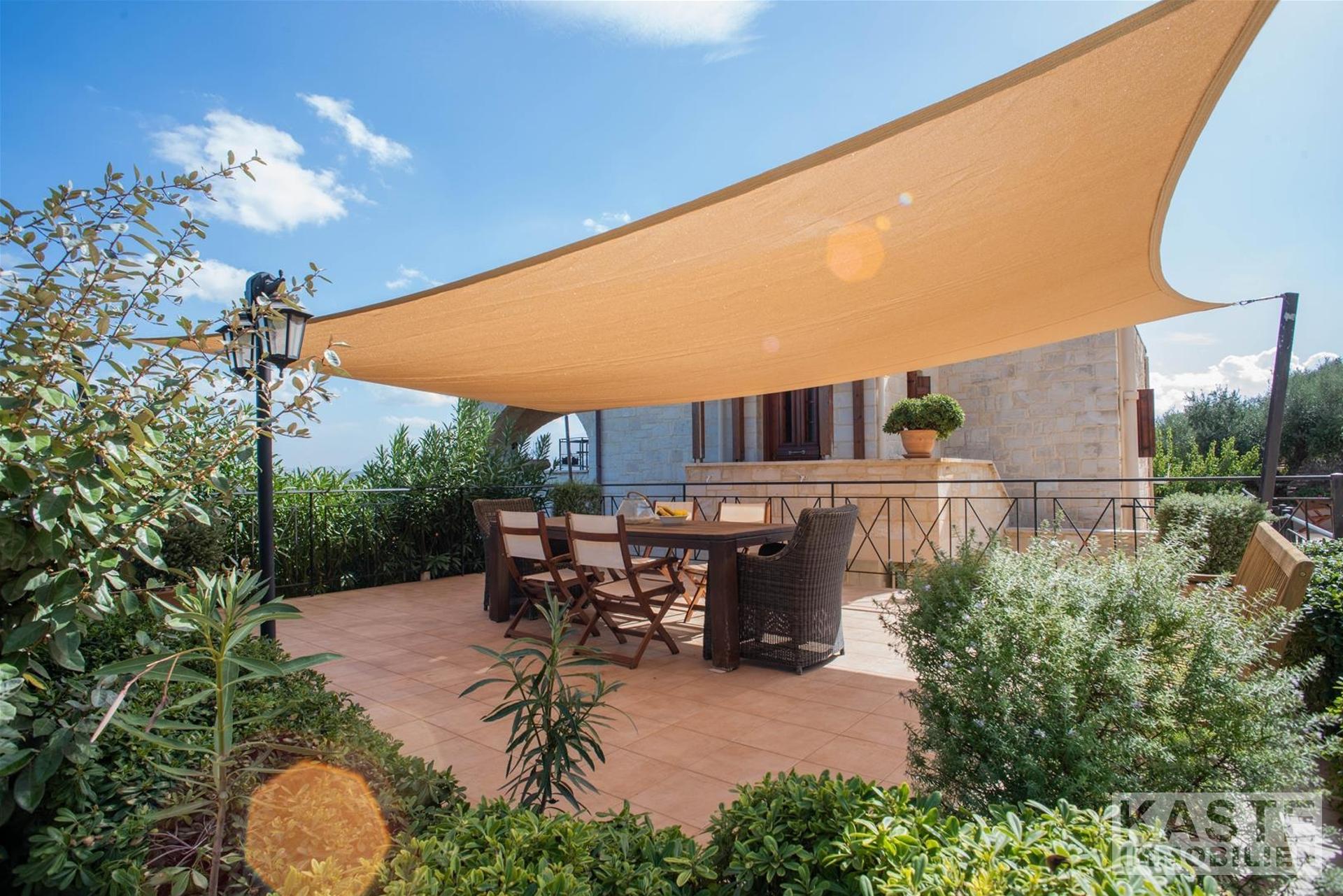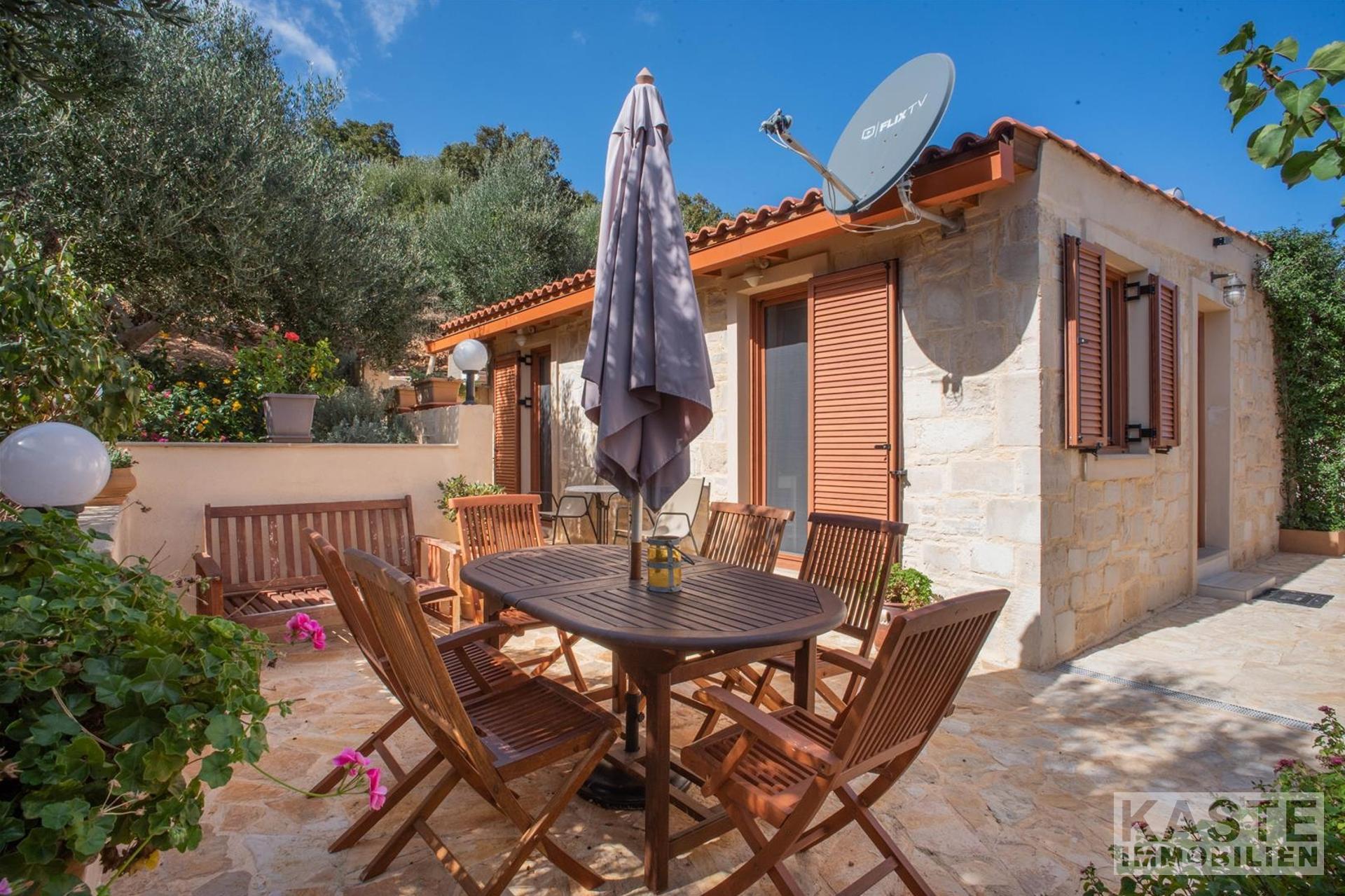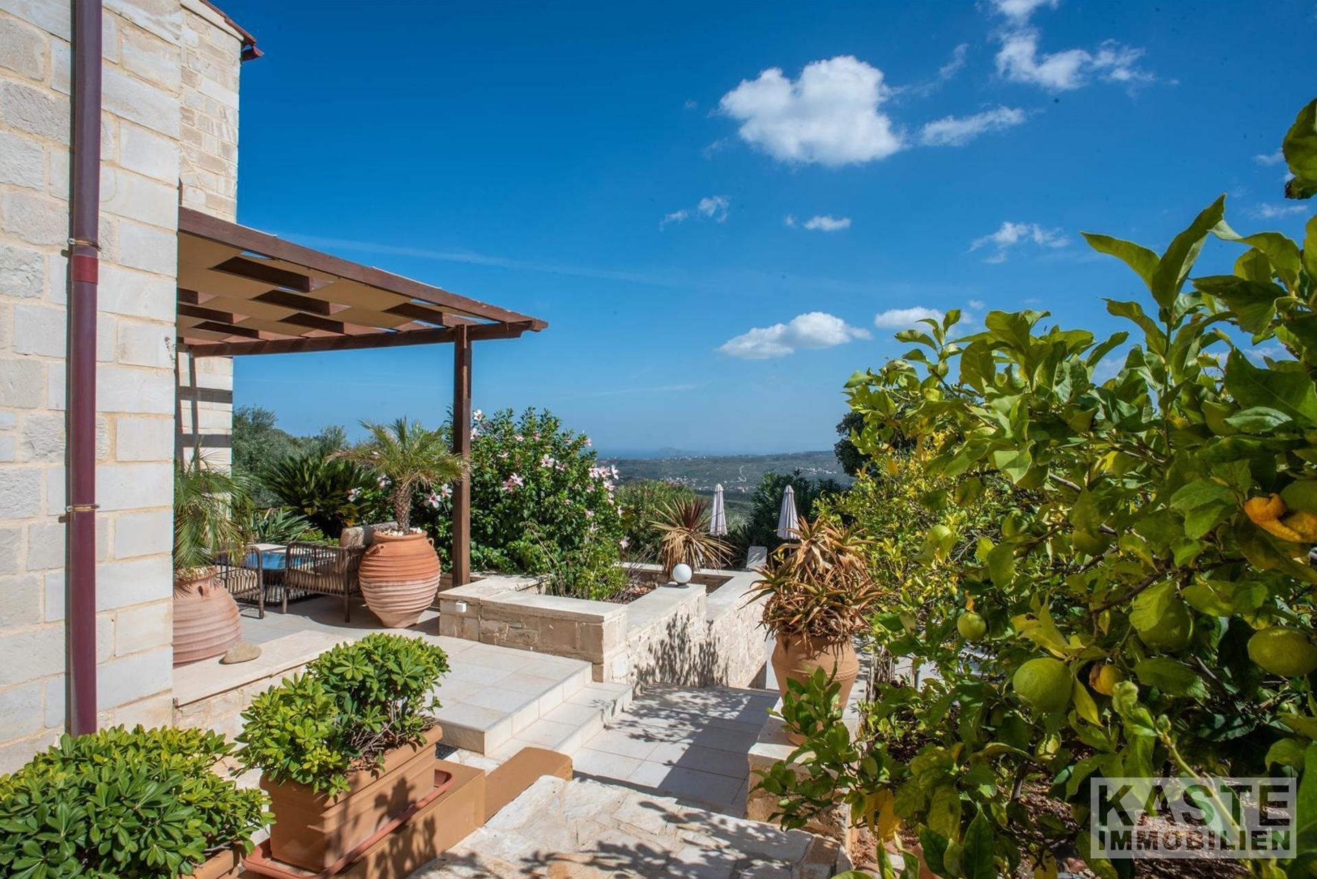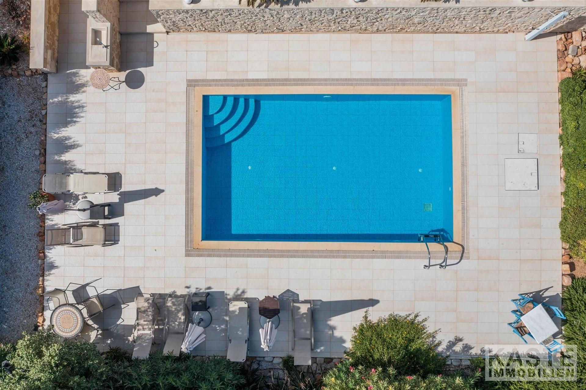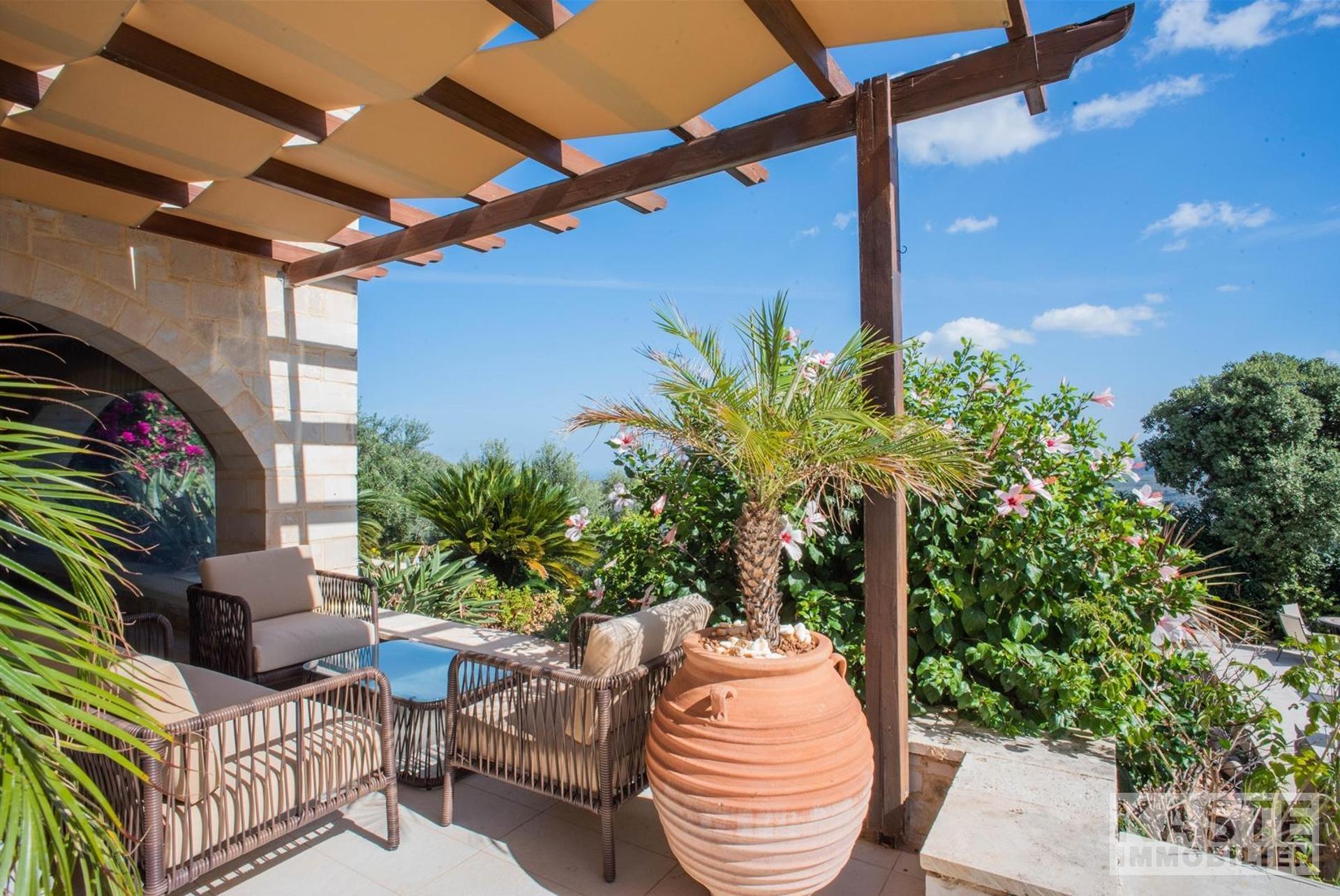 Der liebevoll gestaltete Außenbereich bietet zahlreiche Sitzgelegenheiten, einen privaten Swimmingpool mit Sonnenliegen und Sonnenschirmen sowie eine große, geflieste Terrasse, die teilweise überdacht ist und perfekte Bedingungen für entspannte Stunden mit Panoramablick schafft. Der Garten ist mit reifen Oliven- und Obstbäumen, darunter Aprikosen- und Orangenbäume, bepflanzt.