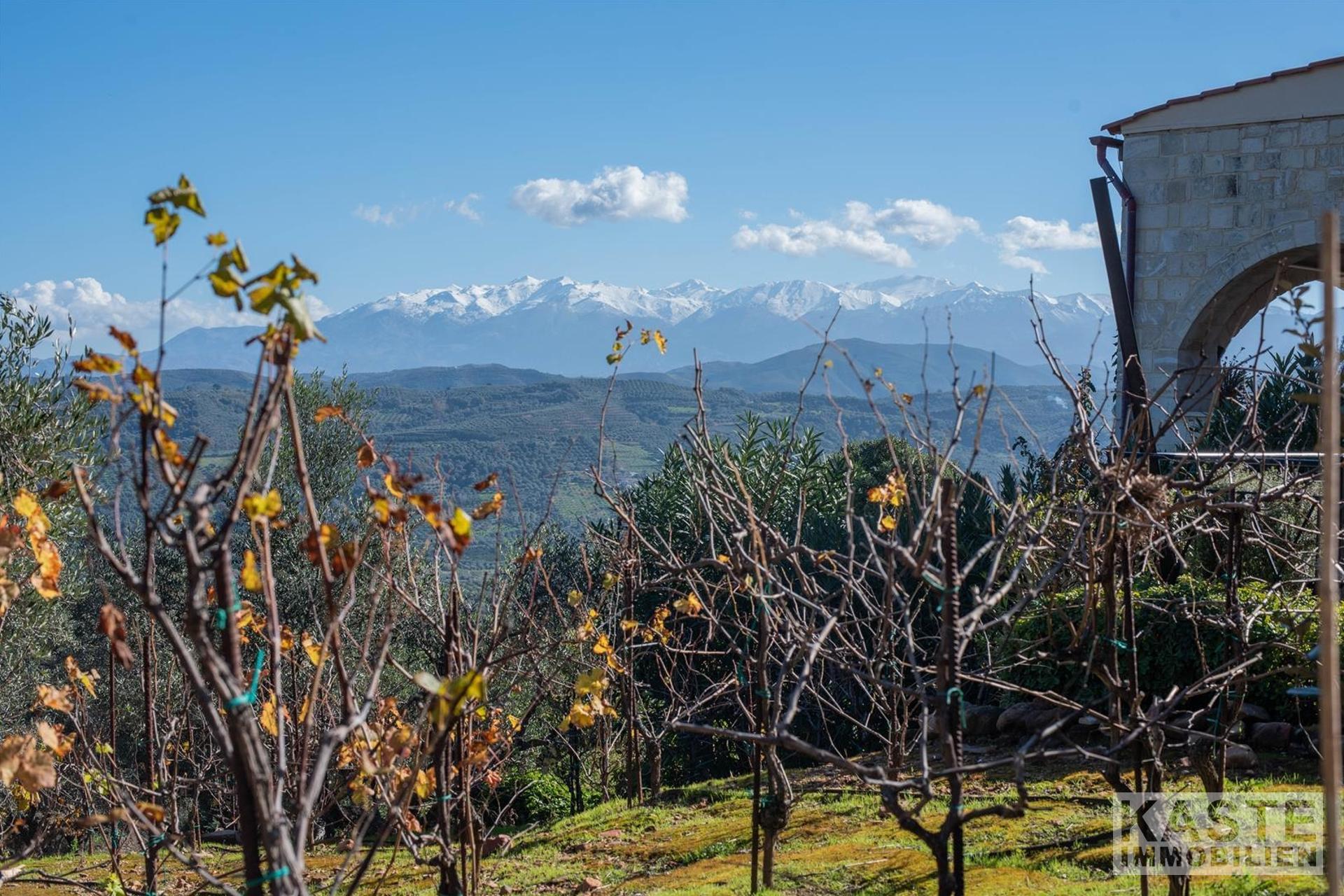 Im Inneren beeindruckt die Villa durch charakteristische Steinbögen und stilvolle Holzdecken, die dem Haus eine warme, authentische Atmosphäre verleihen. Eine großzügige Terrasse im Obergeschoss eröffnet einen atemberaubenden, ungehinderten Blick auf das azurblaue Meer und die majestätischen Weißen Berge.