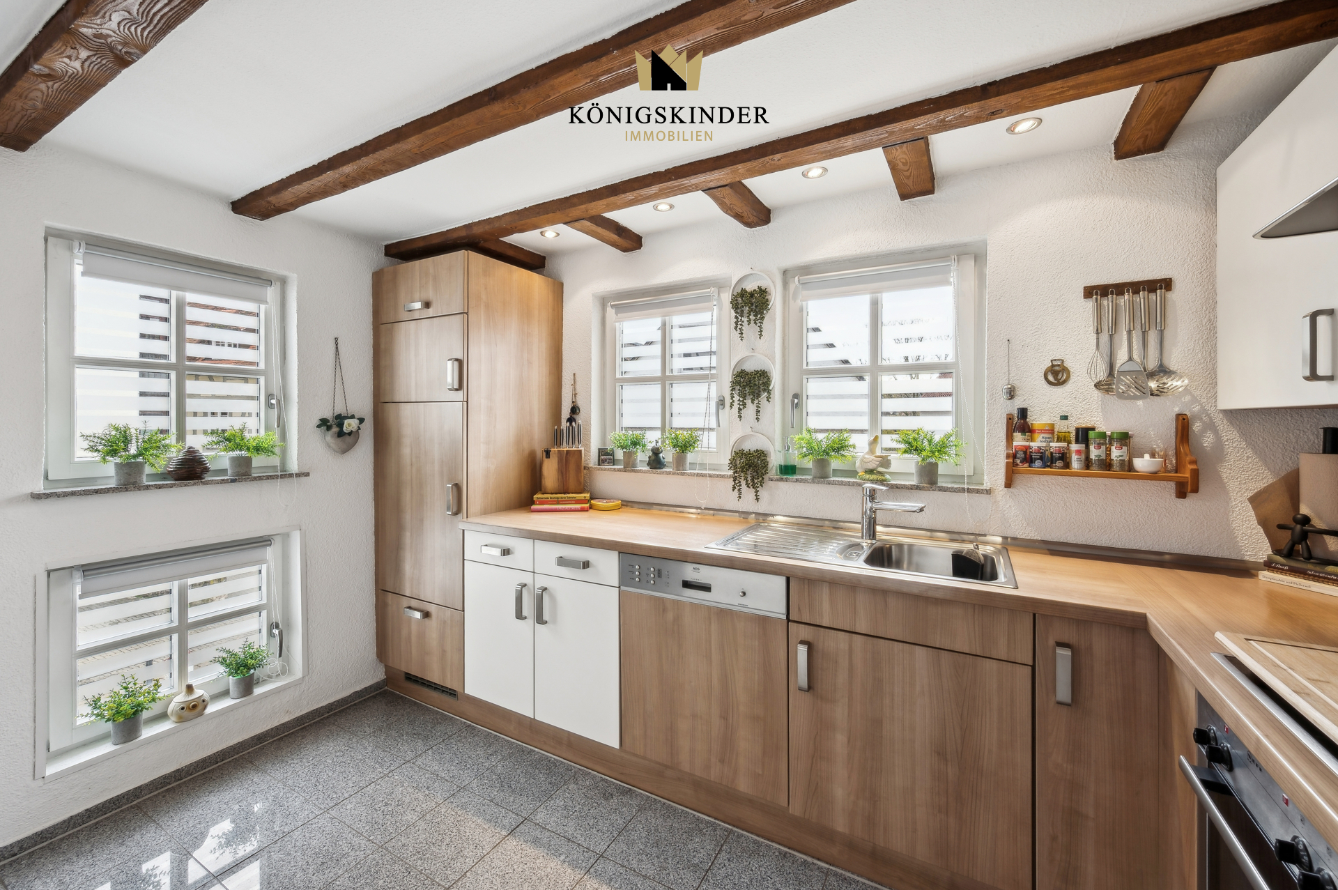 Die helle Einbauküche mit Essplatz und das modernisierte Bad mit Badewanne und Handtuchwärmer runden das Angebot ab. Praktische Details wie eine Abstellkammer im Schlafraum und das Abteil im historischen Gewölbekeller sorgen dafür, dass alles seinen Platz findet. Ihr Fahrzeug steht sicher auf dem eigenen Stellplatz direkt am Haus.