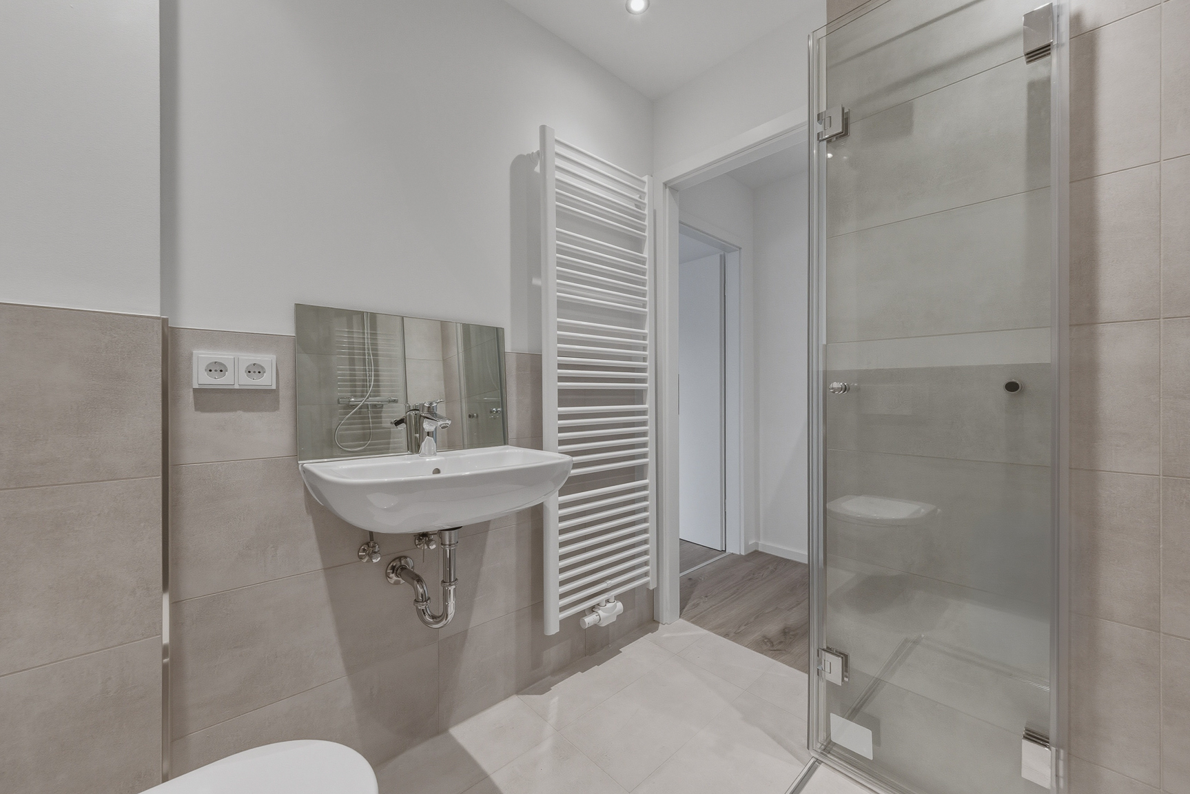 Das Badezimmer wurde hochwertig erneuert und präsentiert sich modern mit Feinsteinzeugfliesen und einer edel verglasten Regendusche. Ein hochwertiges Waschbecken mit edlen Armaturen sowie eine neue Toilette vervollständigen das schöne Bad. Ein Waschmaschinenanschluss ist hier praktischerweise ebenfalls vorhanden.