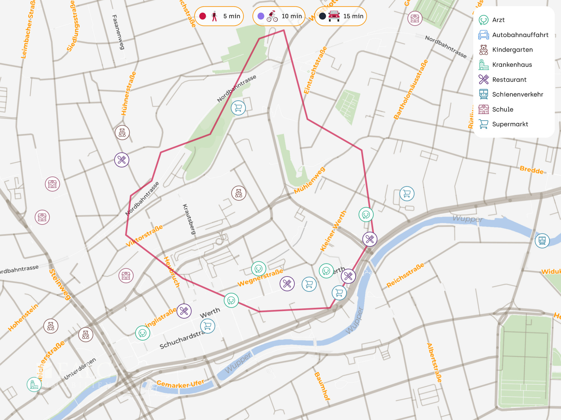 Die Eigentumswohnung befindet sich in einer zentralen und gut angebundenen Wohnlage im Wuppertaler Stadtteil Barmen. Hier profitieren Bewohner von einer hervorragenden Infrastruktur mit kurzen Wegen zu Einkaufsmöglichkeiten, Bildungseinrichtungen und Freizeitangeboten. Für den täglichen Bedarf stehen zahlreiche Supermärkte, Bäckereien, Drogerien und Apotheken in direkter Umgebung zur Verfügung. Auch kleine Fachgeschäfte sowie Dienstleister wie Banken, Postfilialen und Ärzte sind schnell erreichbar. Darüber hinaus bietet das nahegelegene Einkaufszentrum Wicküler City oder die City-Arkaden eine noch größere Auswahl an Geschäften und gastronomischen Angeboten.