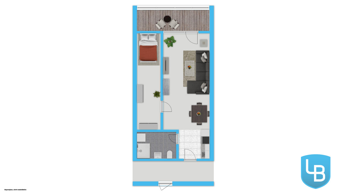 AUFTEILUNG 1,5-ZIMMER-WOHNUNG - ca. 39 qm: + Hochwertige-Einbaupantryküche + Innenliegendes Duschbad mit Waschmaschine + Wohnzimmer mit verglaster Loggia + Schlafzimmer