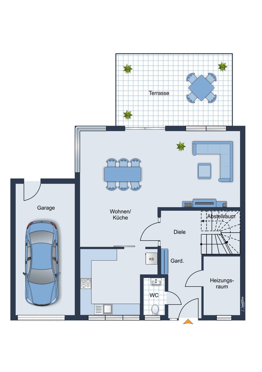 KücheWohnzimmerSchlafzimmerBadezimmerGäste-WCFlur ErdgeschossTerrasseGartenGartenBlick vom ObergeschossErdgeschossDachgeschossHausansicht