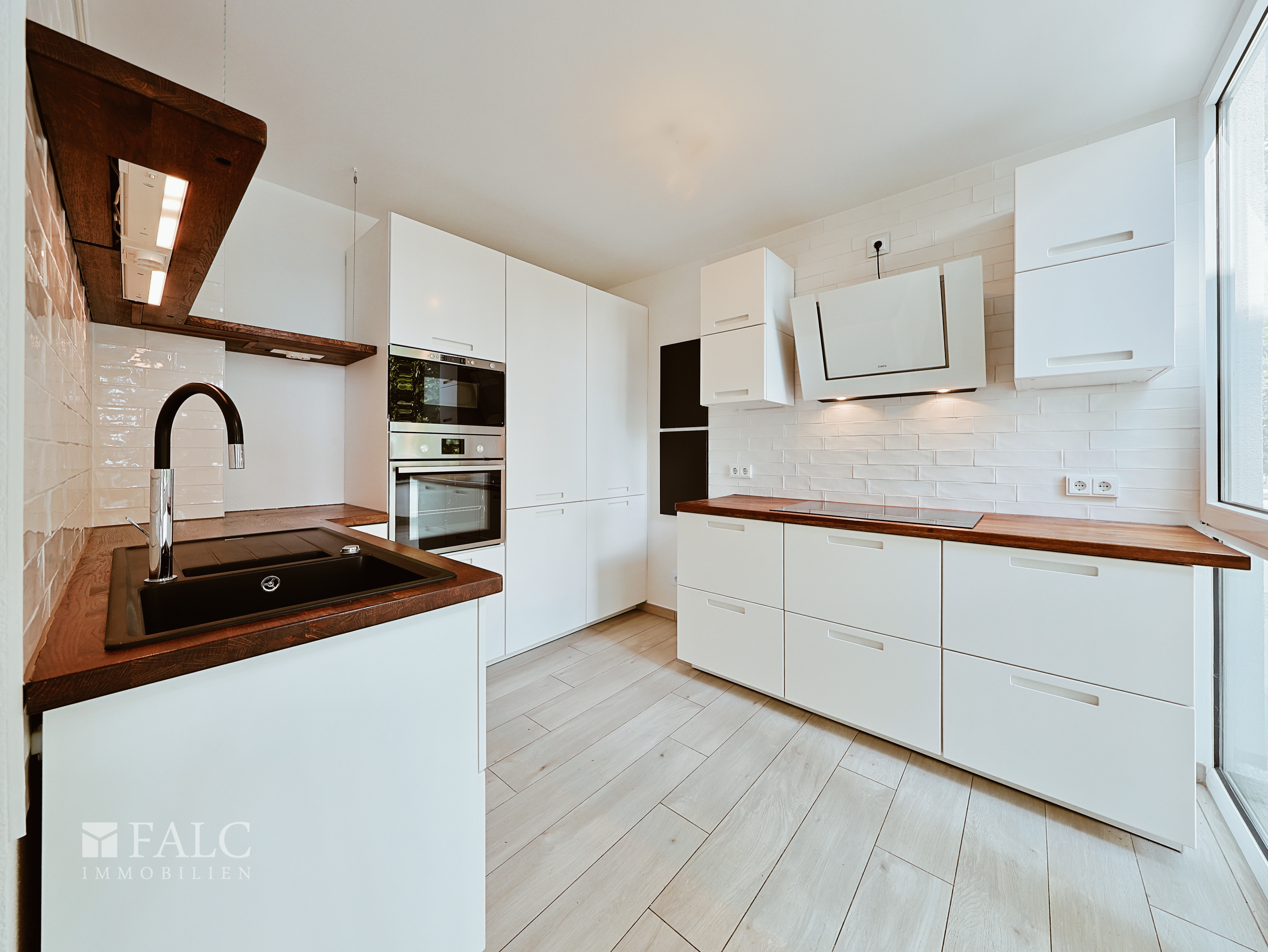 Großzügige Fensterflächen sorgen in allen Bereichen für ein helles, freundliches Wohnambiente. Die moderne Einbauküche mit Blick ins Grüne fügt sich harmonisch in das offene Wohnkonzept ein und bietet ideale Voraussetzungen für kulinarische Abende in stilvollem Rahmen.