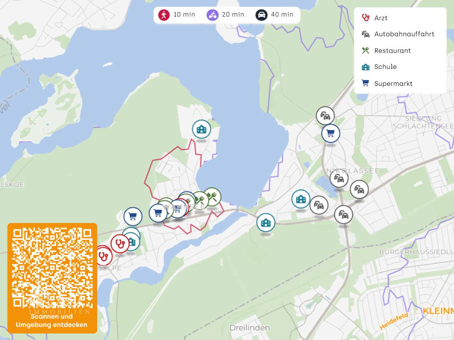 Die Umgebung ist geprägt von gepflegten Villen, altem Baumbestand und einer angenehm zurückhaltenden Nachbarschaft. Trotz der naturnahen Lage sind alle Dinge des täglichen Bedarfs bequem erreichbar: Vom Bahnhof Wannsee erreichen Sie in unter 30 Minuten das Zentrum Berlins oder in nur 6 Minuten den Potsdamer Hauptbahnhof. Werfen Sie auch einen Blick in unsere exklusive FALC Standortanalyse!